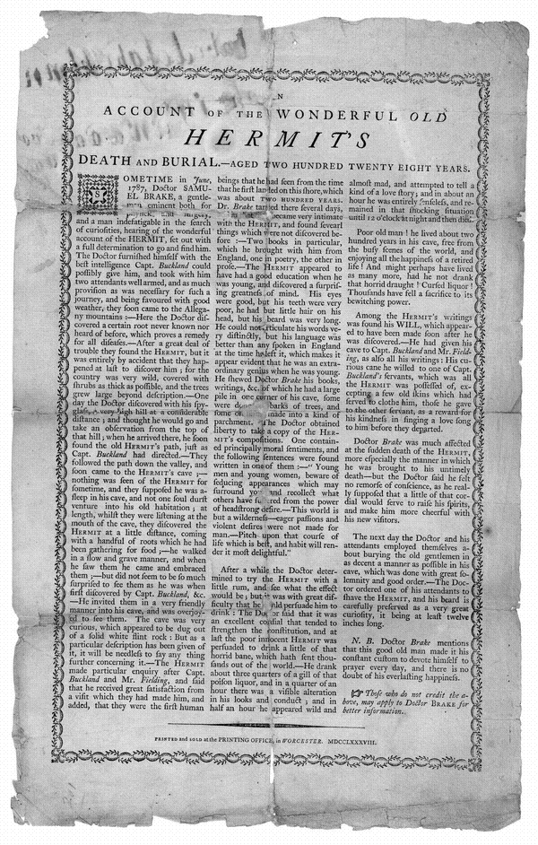 An Account of the Wonderful Old Hermit's Death and Burial, Aged Two Hundred Twenty Eight Years: an Eighteenth-century American Broadside