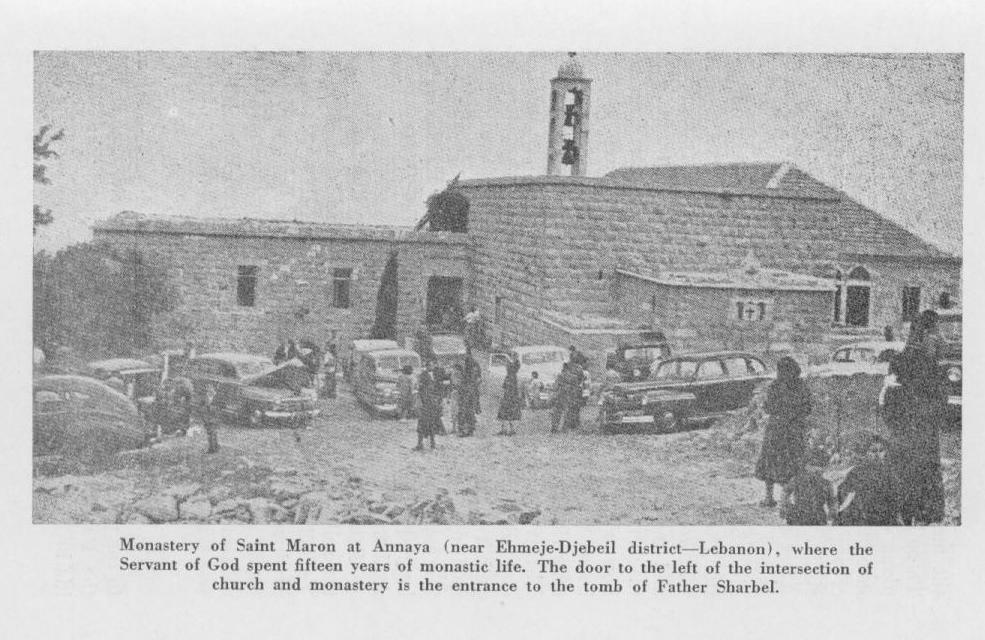 Eid describes the hermitage at the summit of Annaya, appearing "like a globe suspended in the sky, dominating the valleys and surrounding mountains." Dwelling at the hermitage at the time was Elisaus Hardini (Elisha Kassab El Hardini), who died in 1875. Sharbel shared the hermitage with Lebawos Hacklani (Libaos El Ramaty) and, after 1880, with Marsalis Mishmashani (Makarios Sawma El Mishmishani) as well. Additionally, there were attending brothers for each hermit.