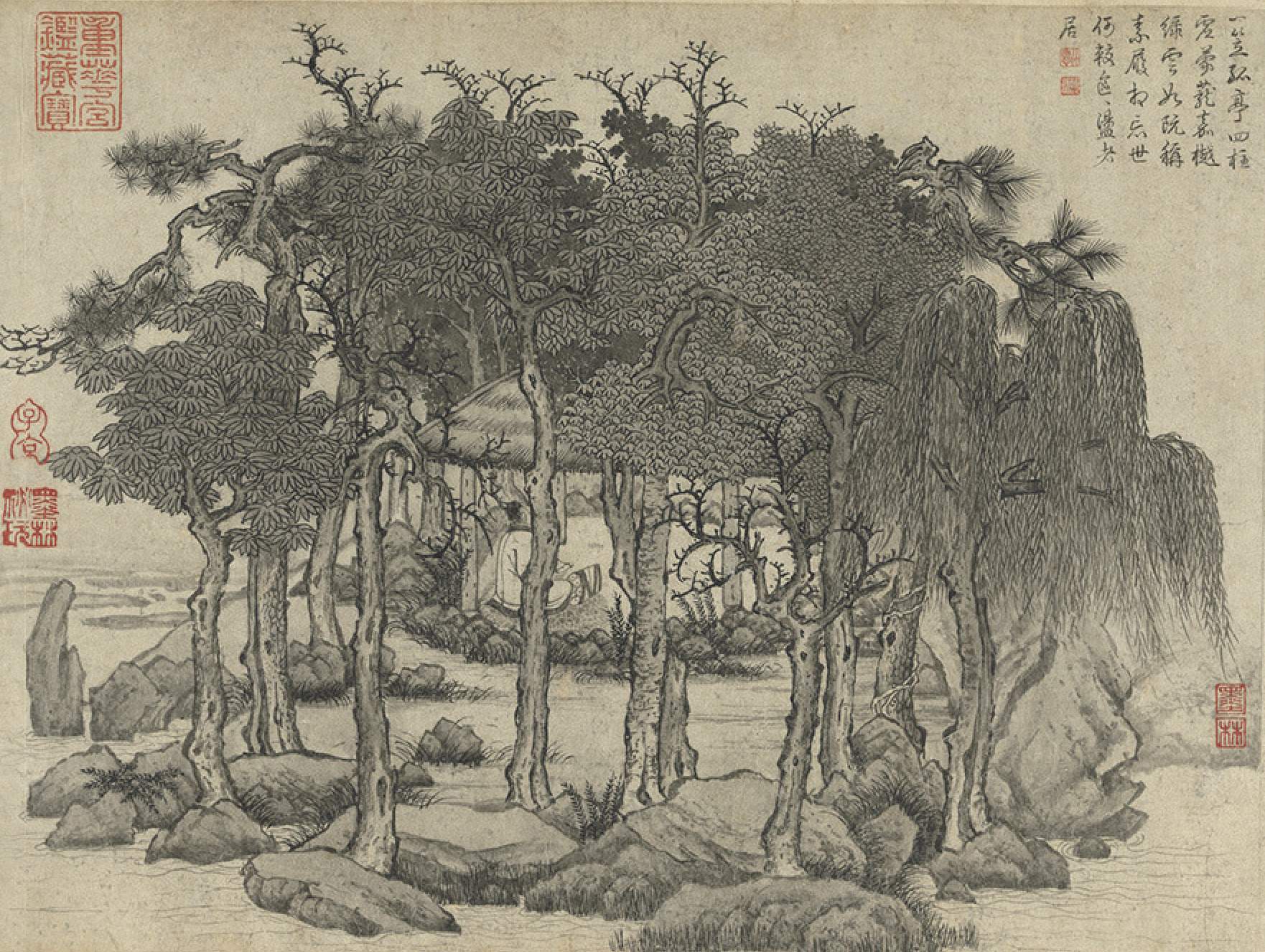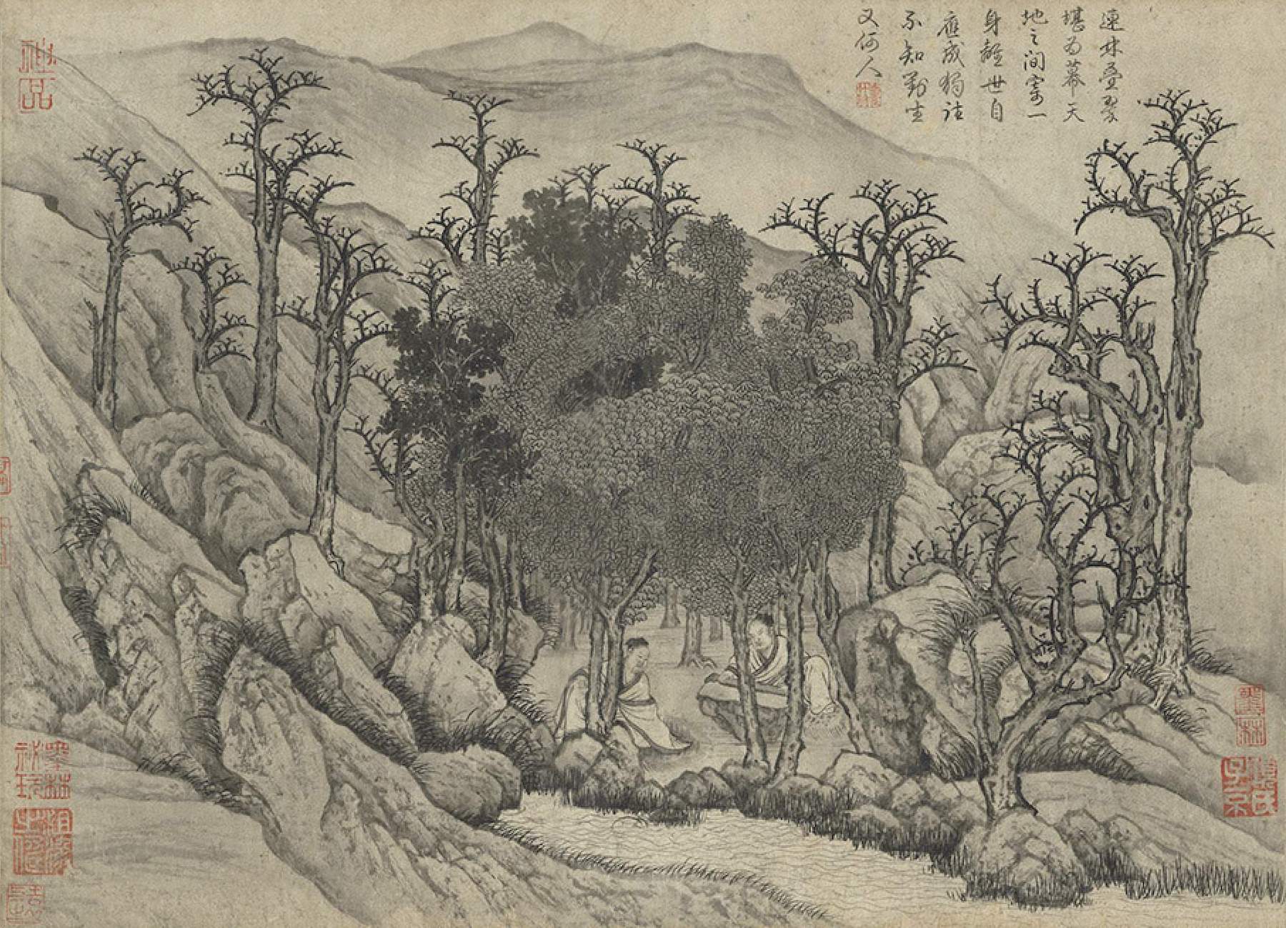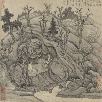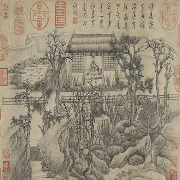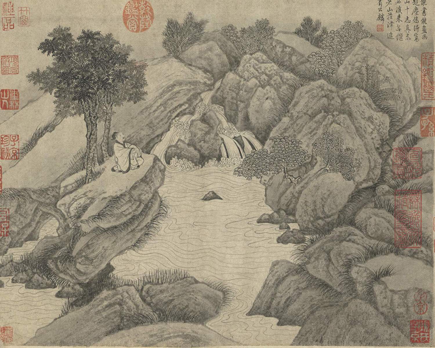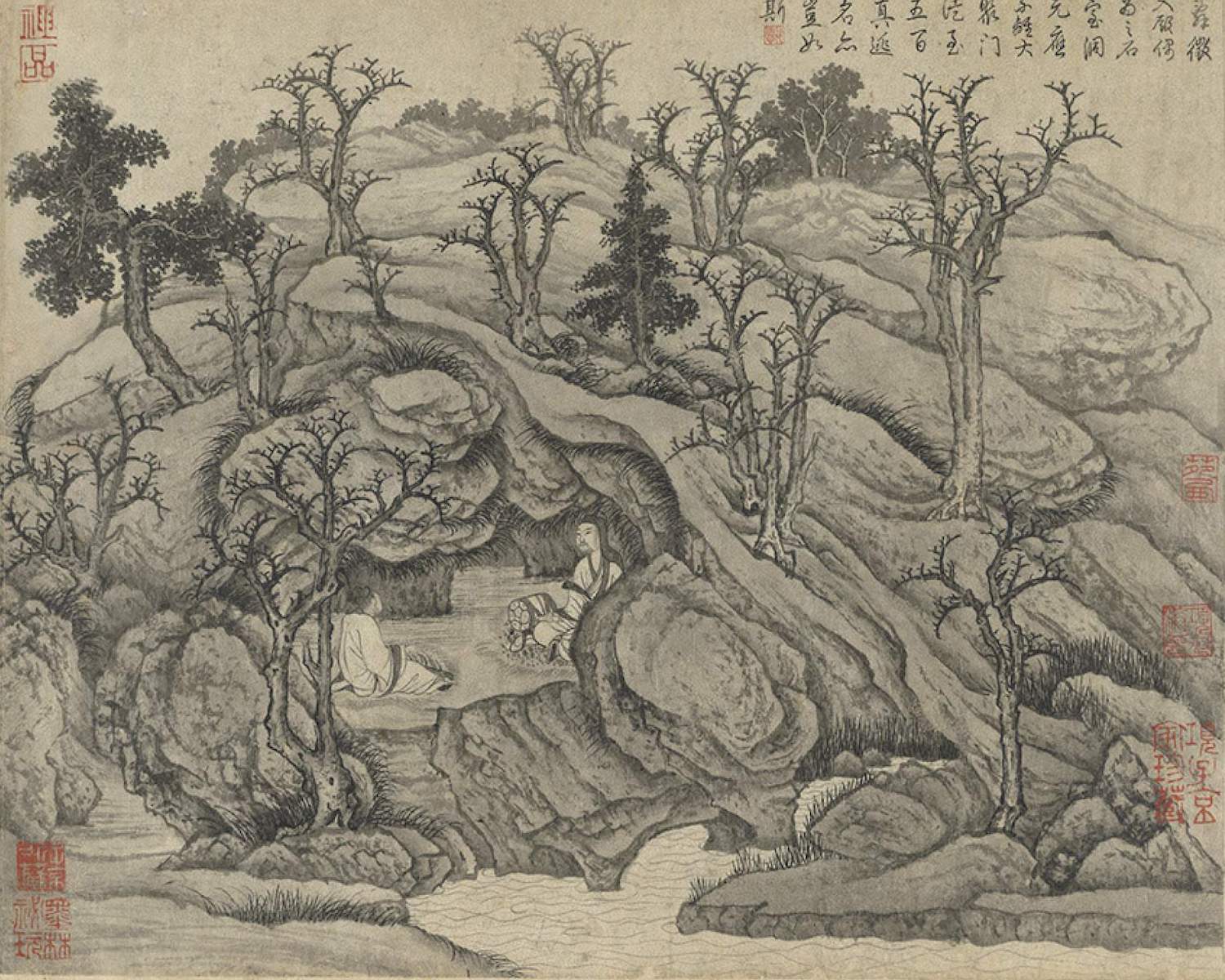 The earliest painting of a hermit theme in China is attributed to Lu Hong of the Tang dynasty era. The works left to us are a masterful copy by a later painter, however, for the original works are lost.