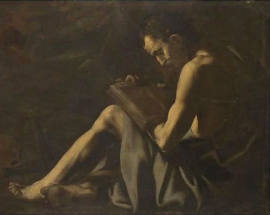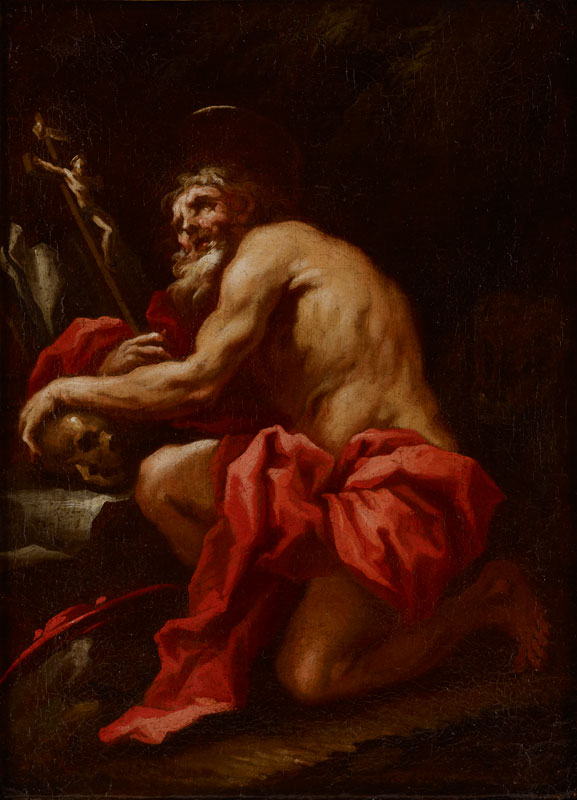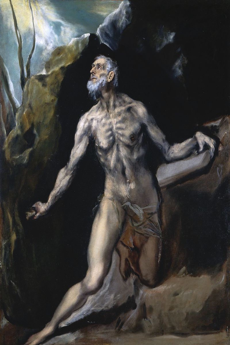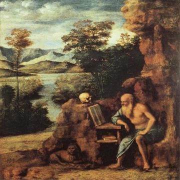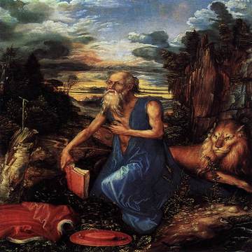 Hieronymus, or Jerome of Stridon (347-420), was a popular subject of painting for serveral reasons. Jerome was an accomplished scholar and ecclesiastical diplomat, known for his famous translation of the Hebrew and Greek Bible into Latin, for his numerous polemical essays, and for receiving the cardinalship. But for our interest Jerome is particularly notable for his biography of St. Paul of Thebes, the first Christian hermit, described by Jerome in a little hagiographical essay intended, in effect, to downplay the storied St. Anthony promoted by Athanasius of Alexandria as the first Christian hermit!