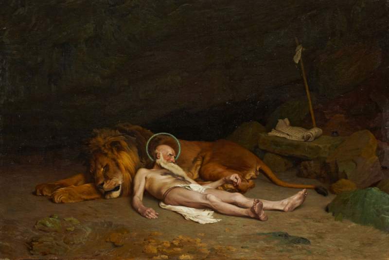 Jerome early confirmed his respect for asceticism by venturing on a five-year stint as a hermit in his young twenties. The painters are clearly intrigued by Jerome's period as a hermit, their depictions often titled as Jerome in the desert or in the wilderness or as a penitent. At the same time, out of exaggerated respect, Jerome is always pictured as a mature figure. The painters often add the color red to his garments, conspicuously referring to Jerome's red robes and hat as a cardinal. The skull on the table or desk (memento mori) reflects the subject's wisdom. Another Jerome identifier is the tame lion appearing in many backgrounds of the paintings. The story of Jerome pulling a thorn from a lion's paw, garnering the lion's life-long affection, is familiar from the ancient Greek tale of Androcles. The lion story not only alludes to the lions that kindly dug the grave of St. Paul of Thebes but fits well the reputation of a hermit's kindness in the desert.