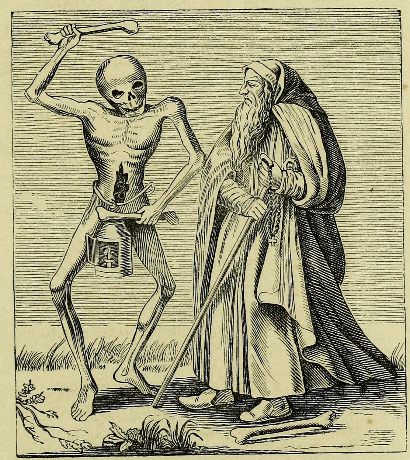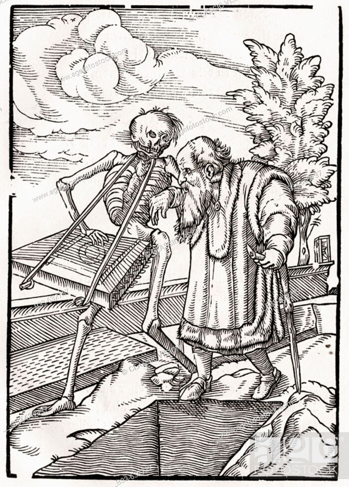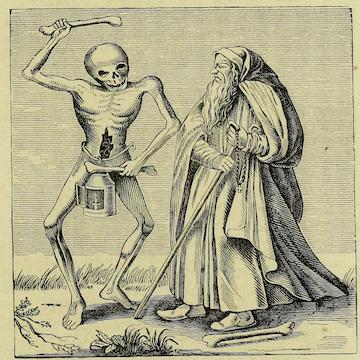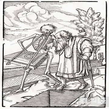 Holbein created a series of images in which Death dances with his inevitable victims represented, a series of social types reminiscent of the stations of life represented in the Tarot. Some call the hermit depicted by Holbein an "old man" but he is indeed a hermit in Holbein's successors as well. In these latter versions, the hermit's reaction to Death is "stoical."