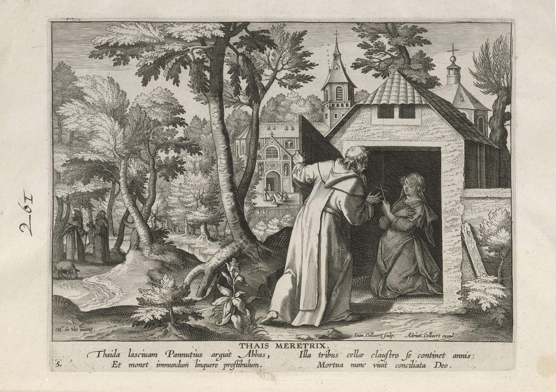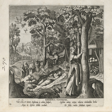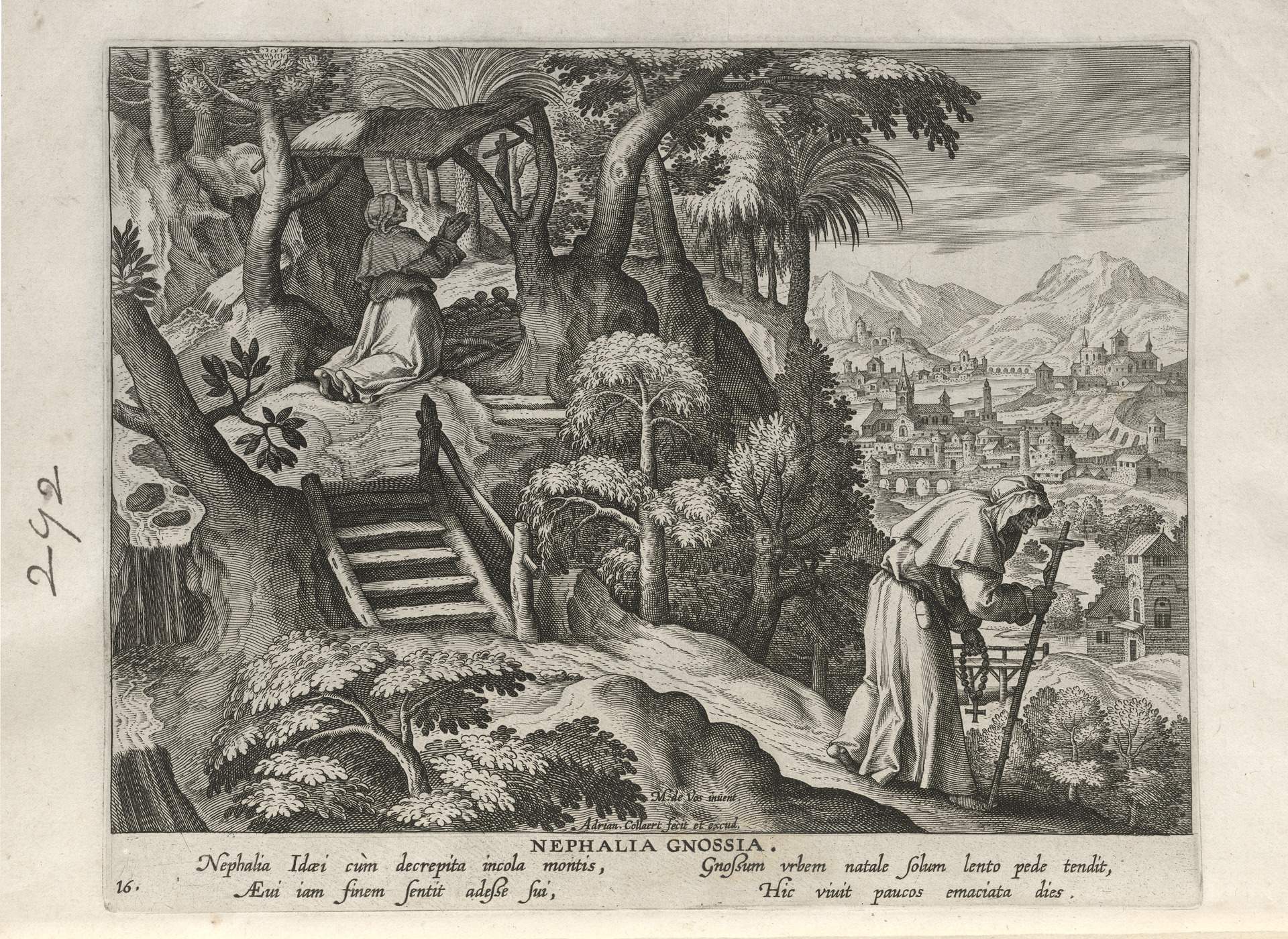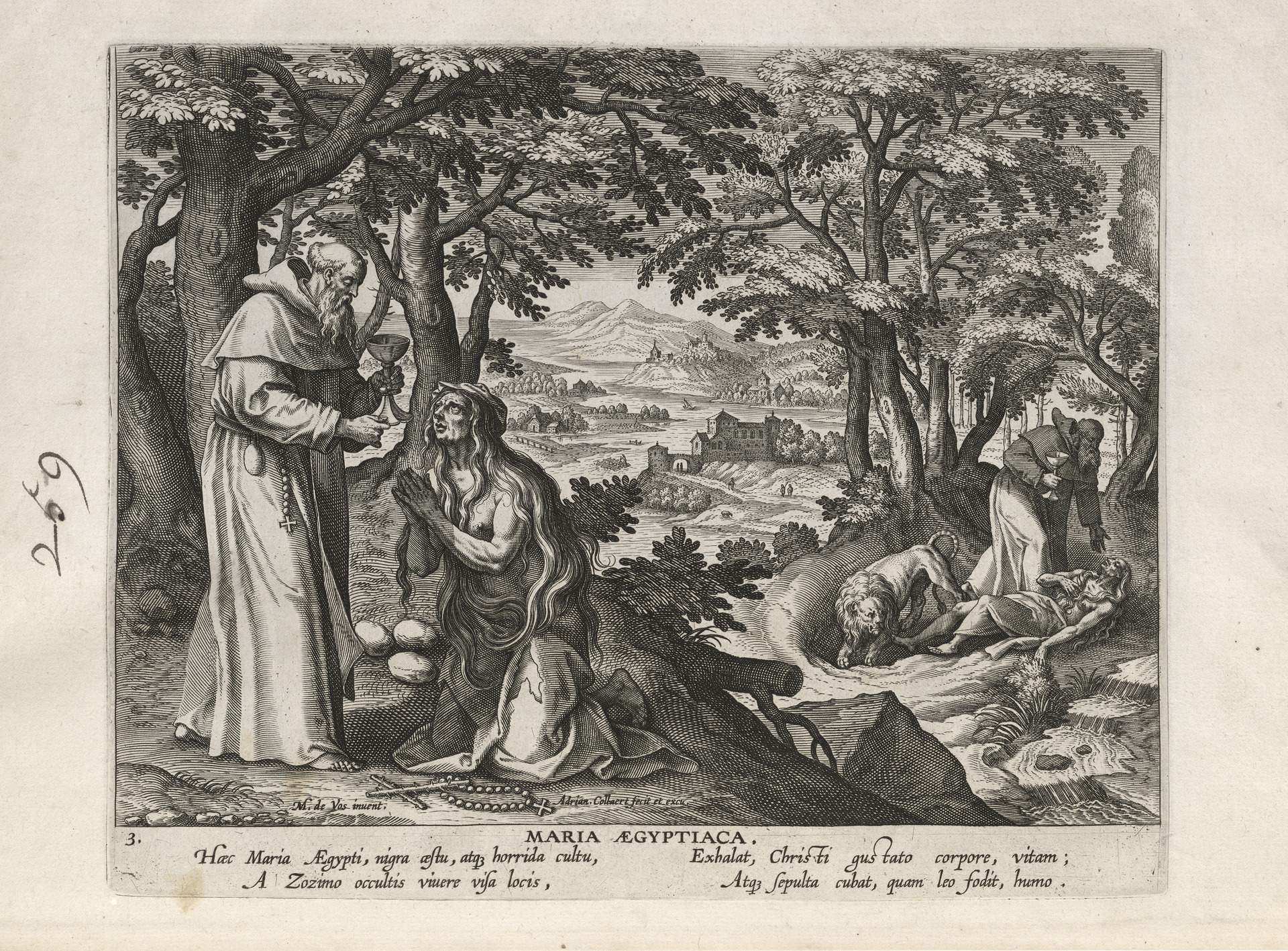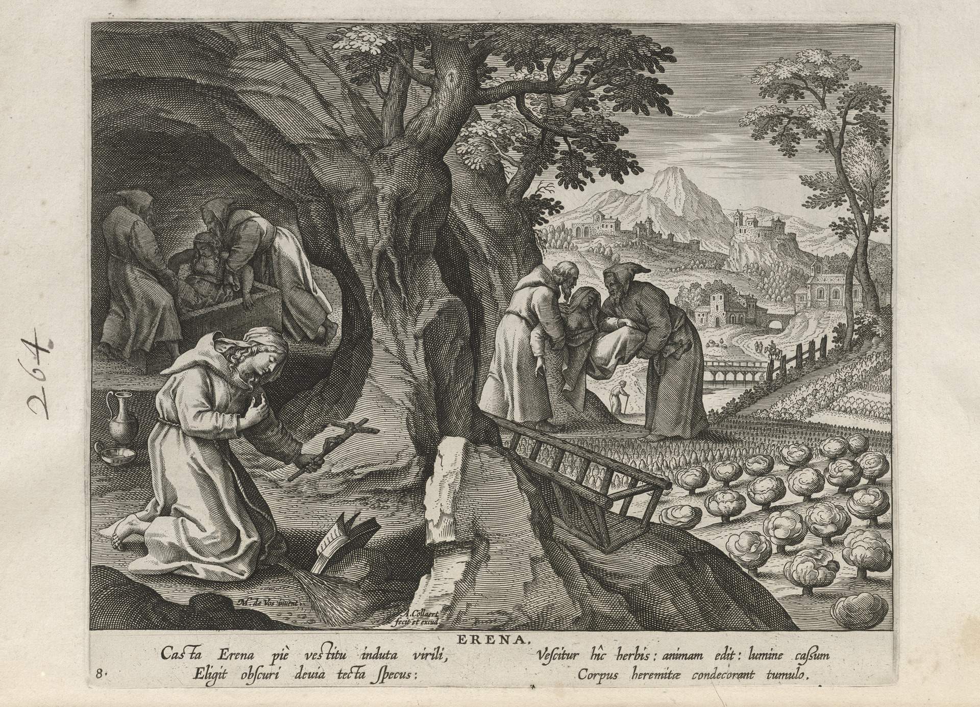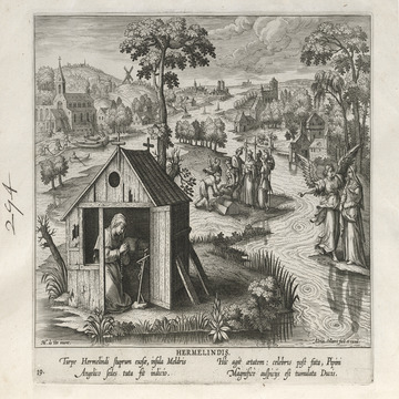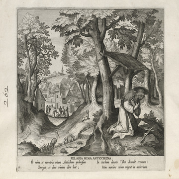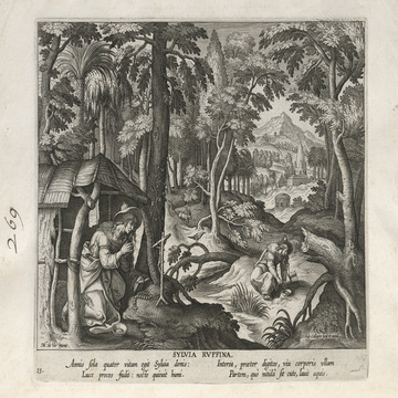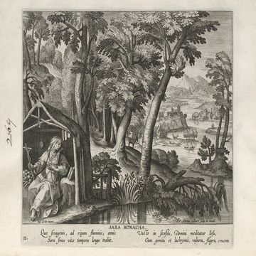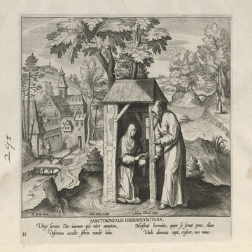 This set of hermit engravings is conspicuously not produced by the Sadeler brothers, but the identification with this school of artisans is clear. The continuity of images and settings is the same: ancient desert Christian hermits, presented in an idyllic semi-rural setting, each hermit busy in her task, always an exemplary prototype.