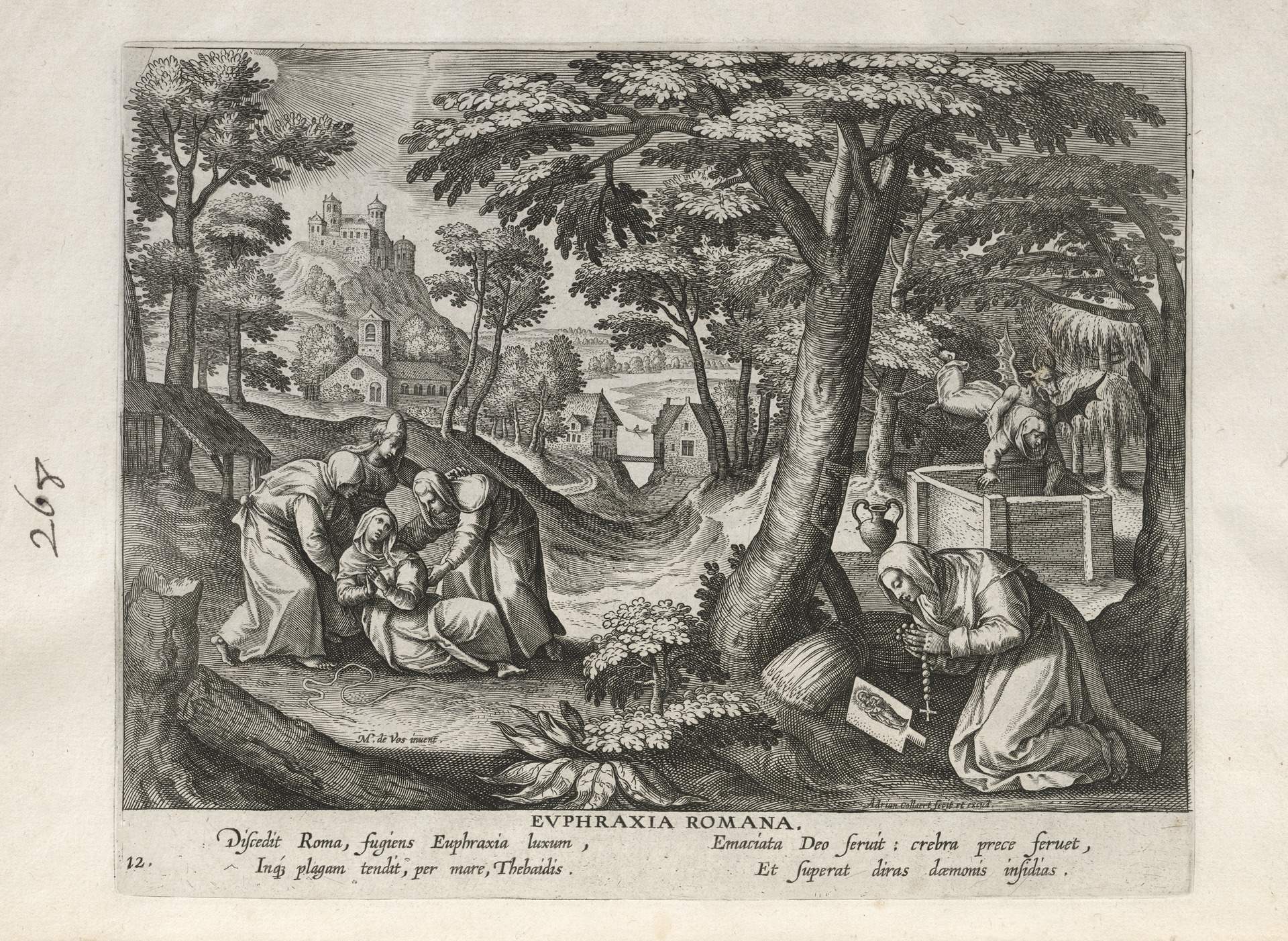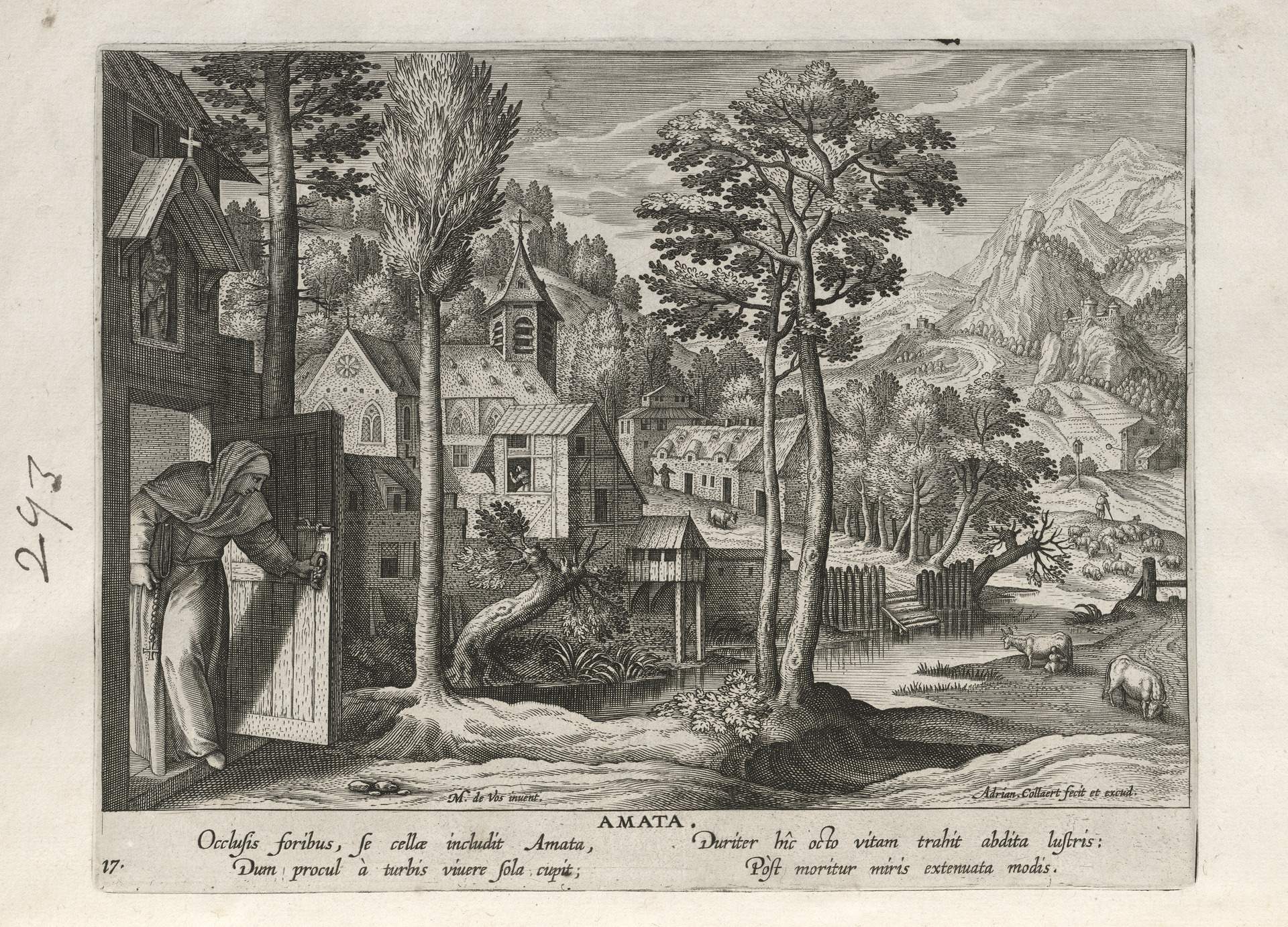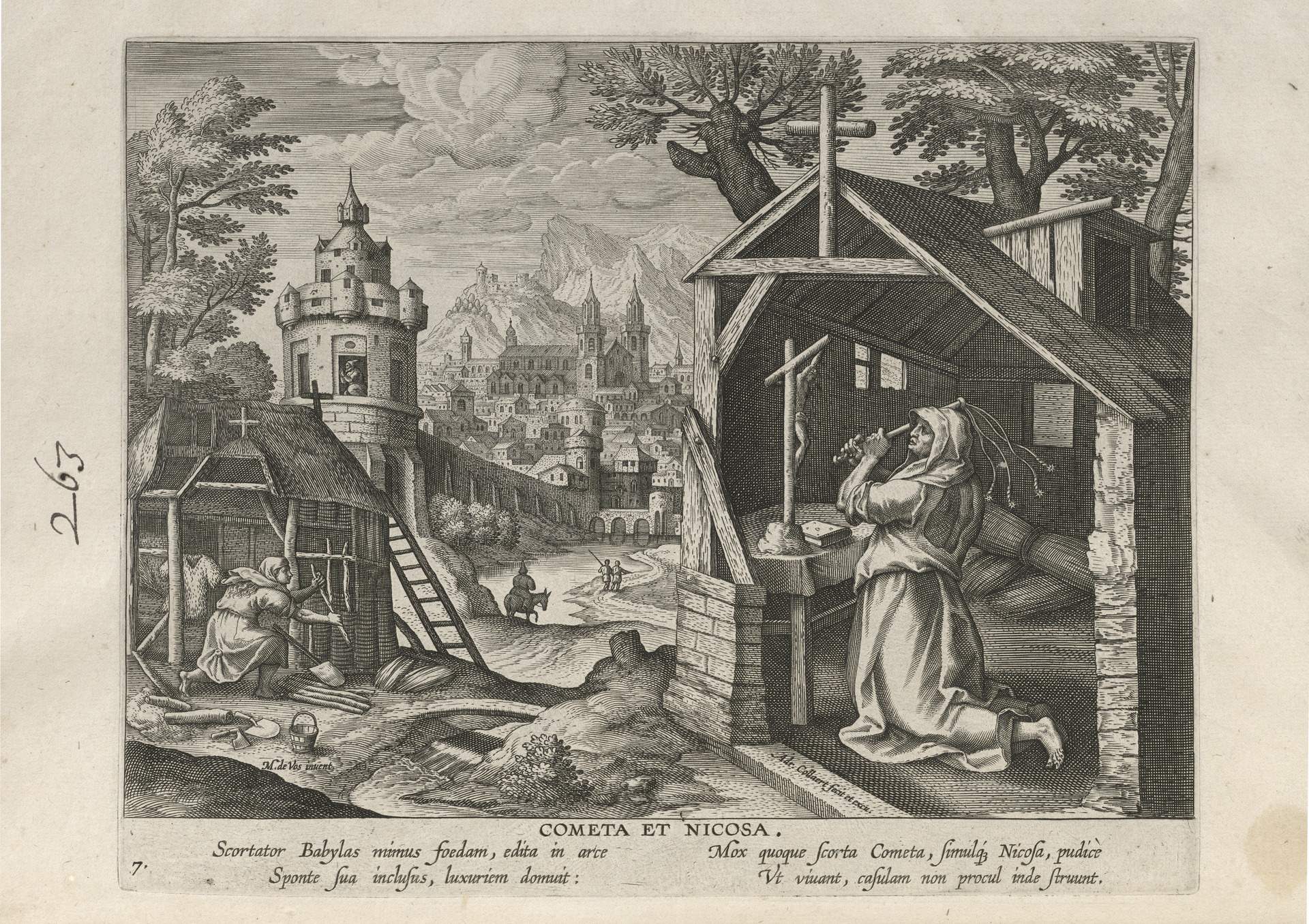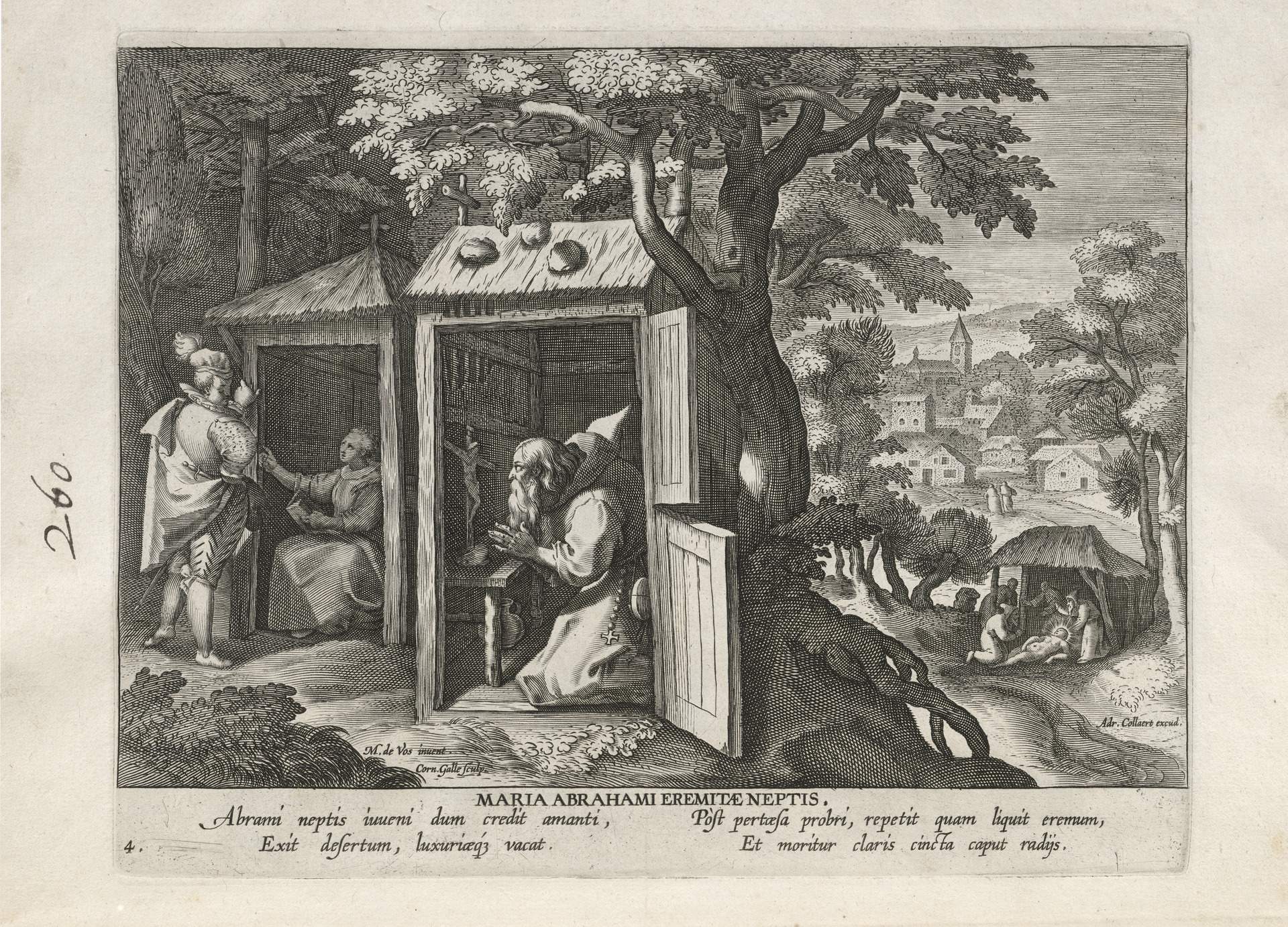 This set of hermit engravings is conspicuously not produced by the Sadeler brothers, but the identification with this school of artisans is clear. The continuity of images and settings is the same: ancient desert Christian hermits, presented in an idyllic semi-rural setting, each hermit busy in her task, always an exemplary prototype.