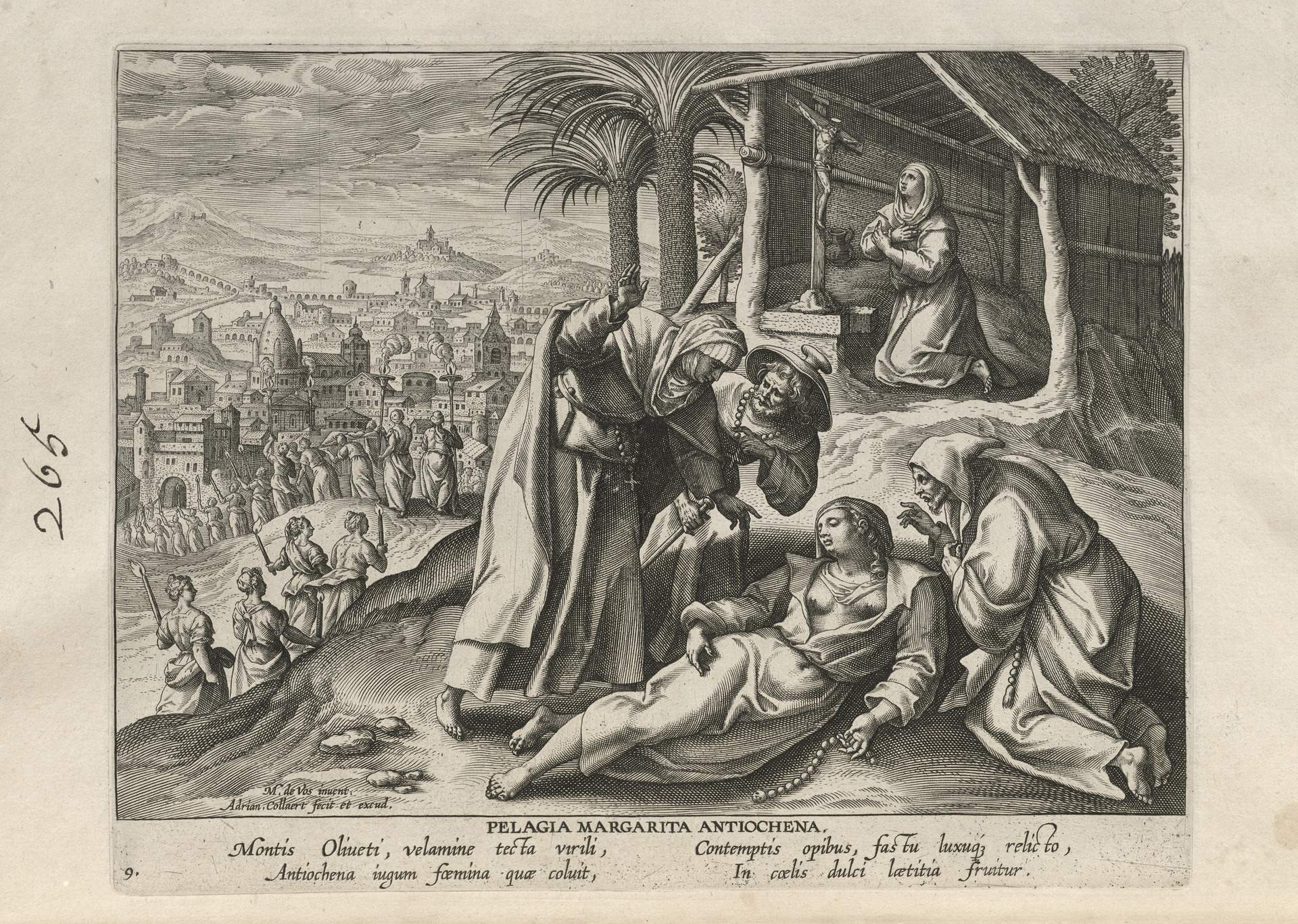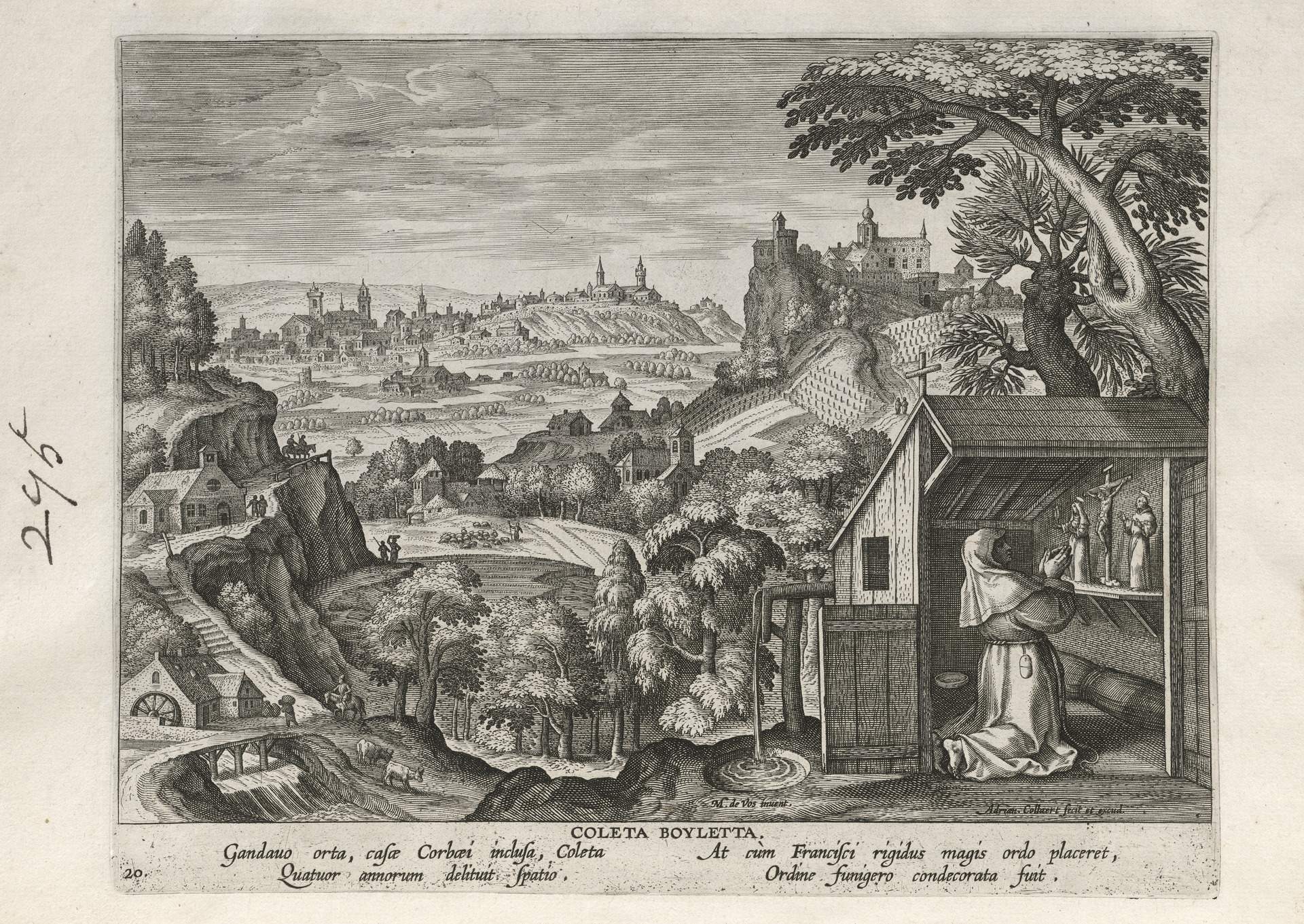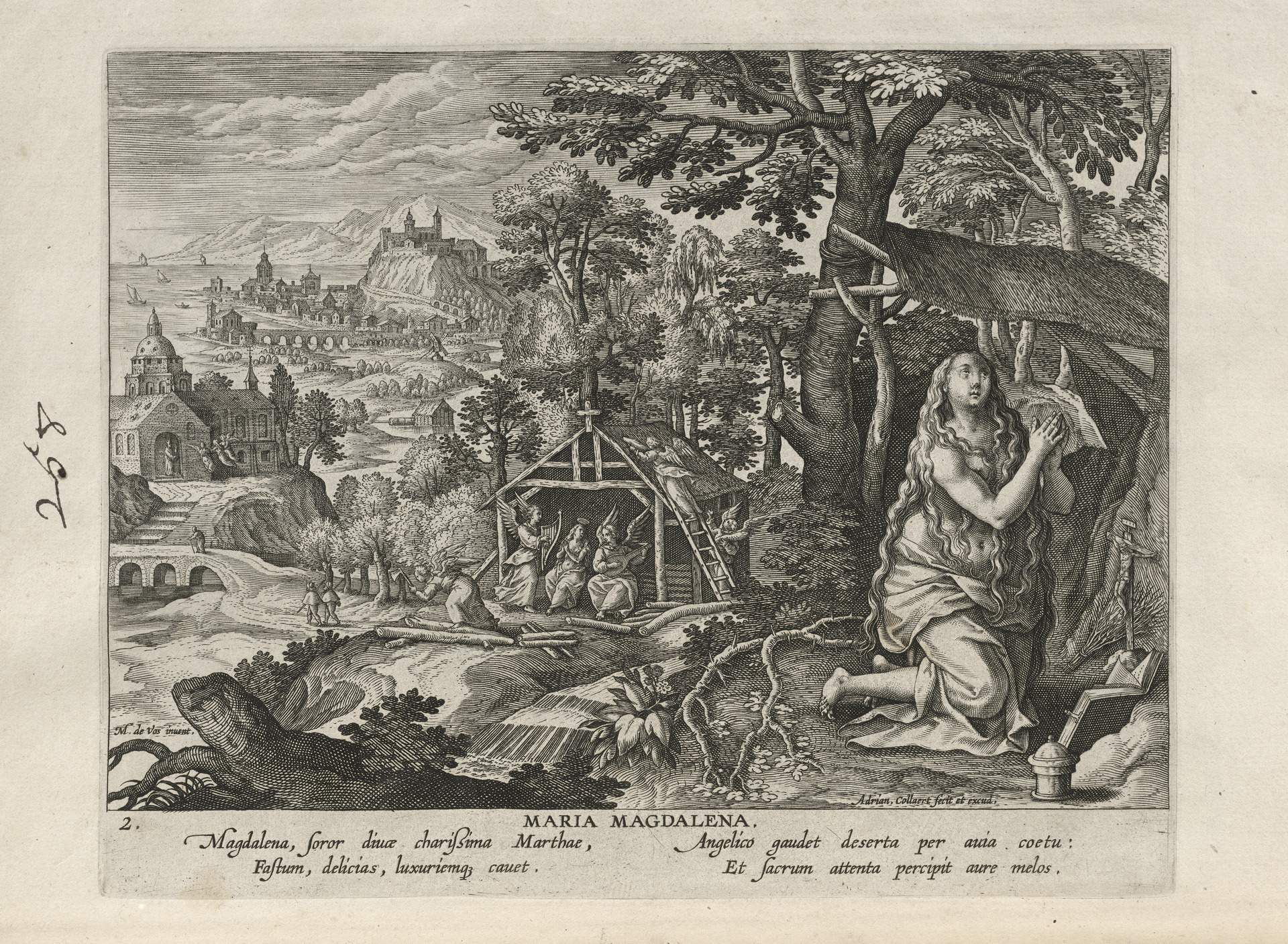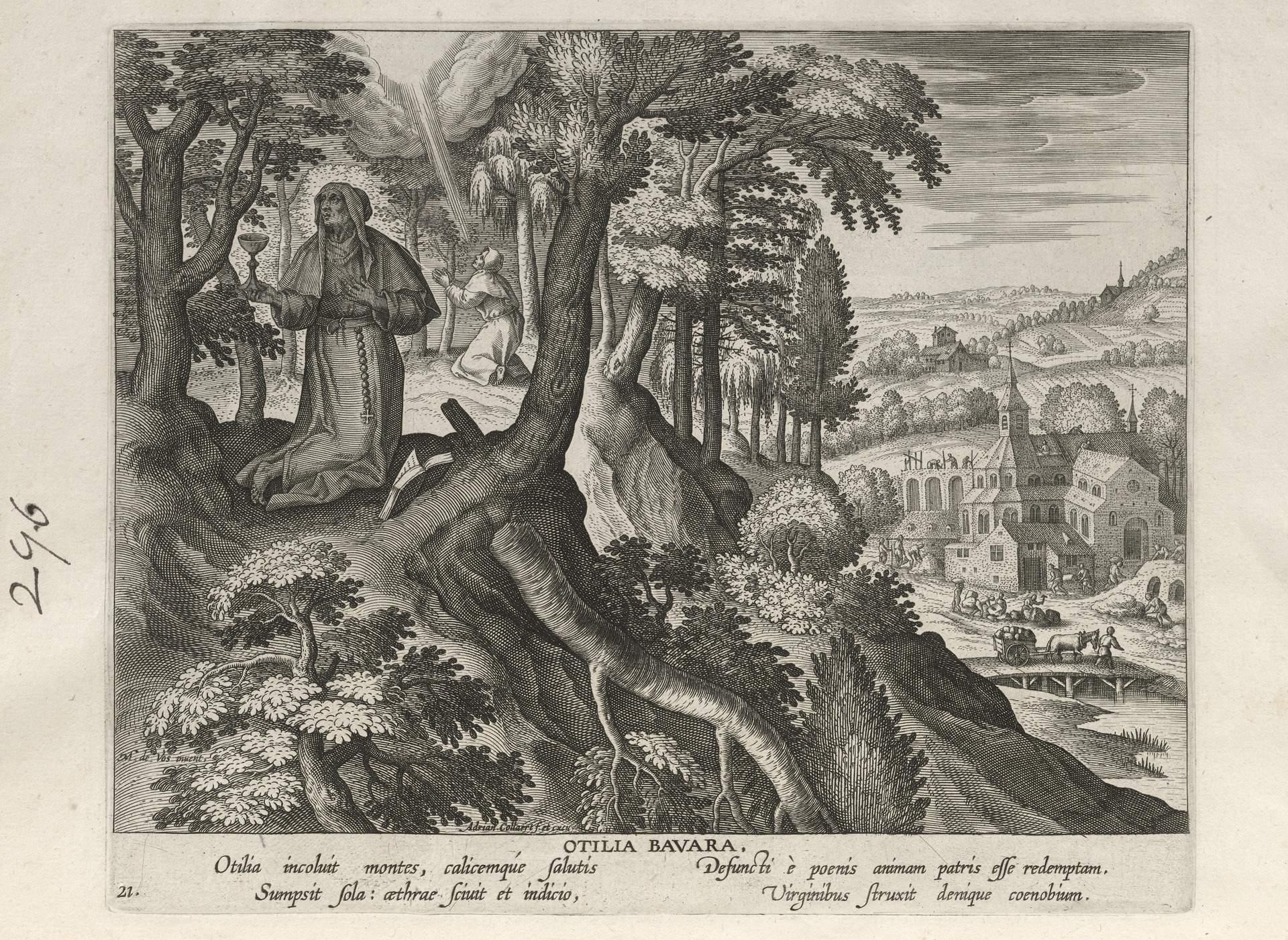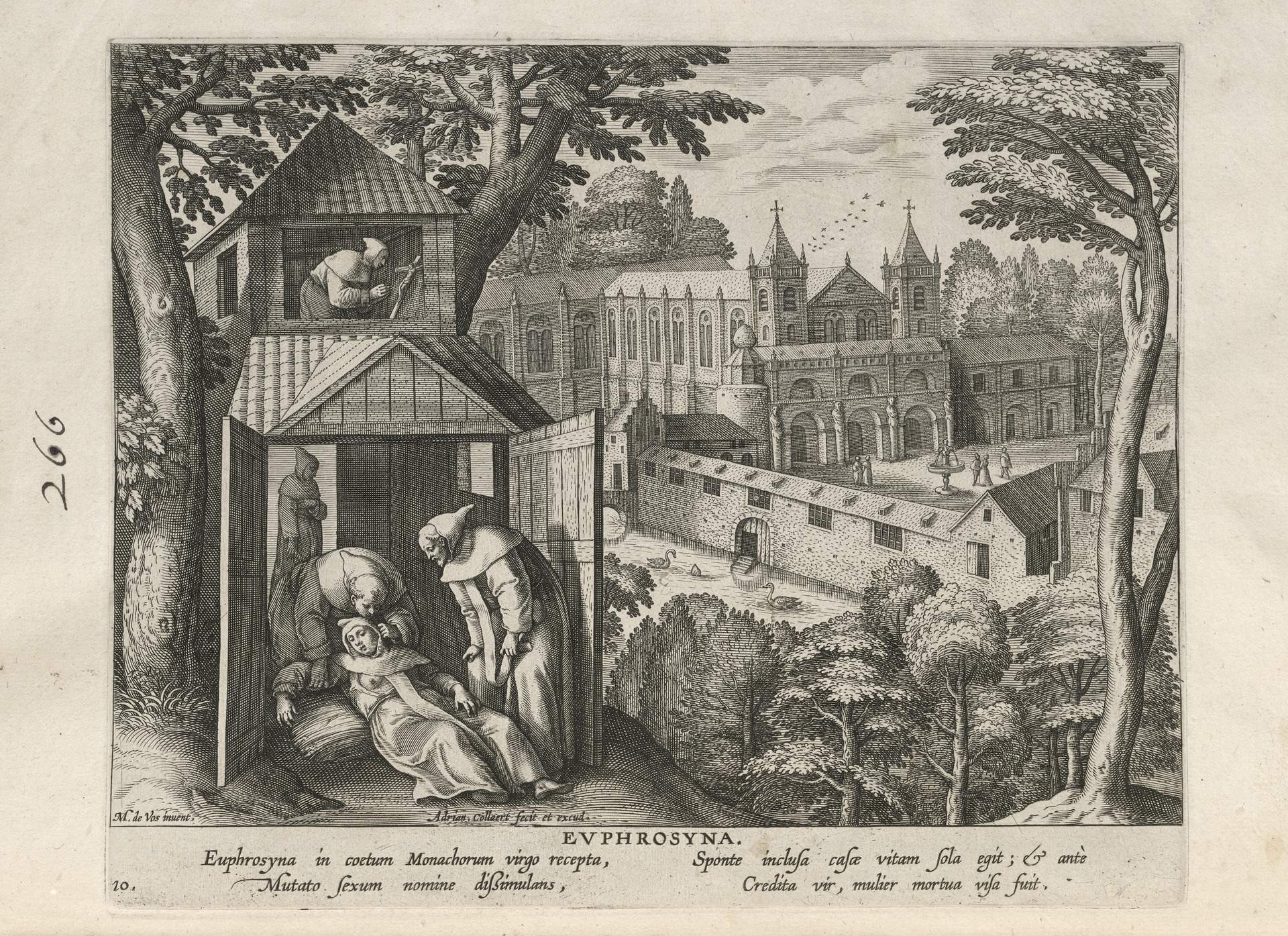 This set of hermit engravings is conspicuously not produced by the Sadeler brothers, but the identification with this school of artisans is clear. The continuity of images and settings is the same: ancient desert Christian hermits, presented in an idyllic semi-rural setting, each hermit busy in her task, always an exemplary prototype.