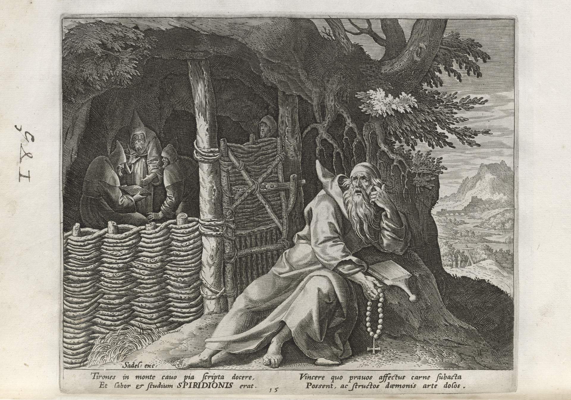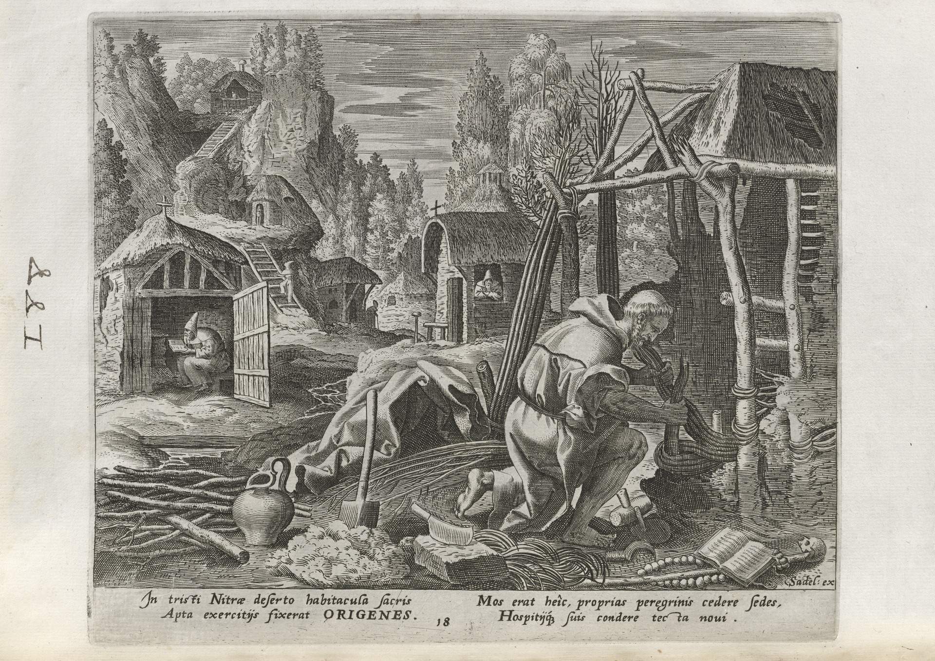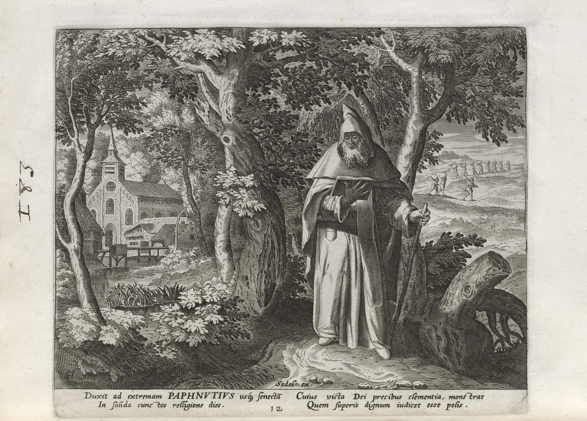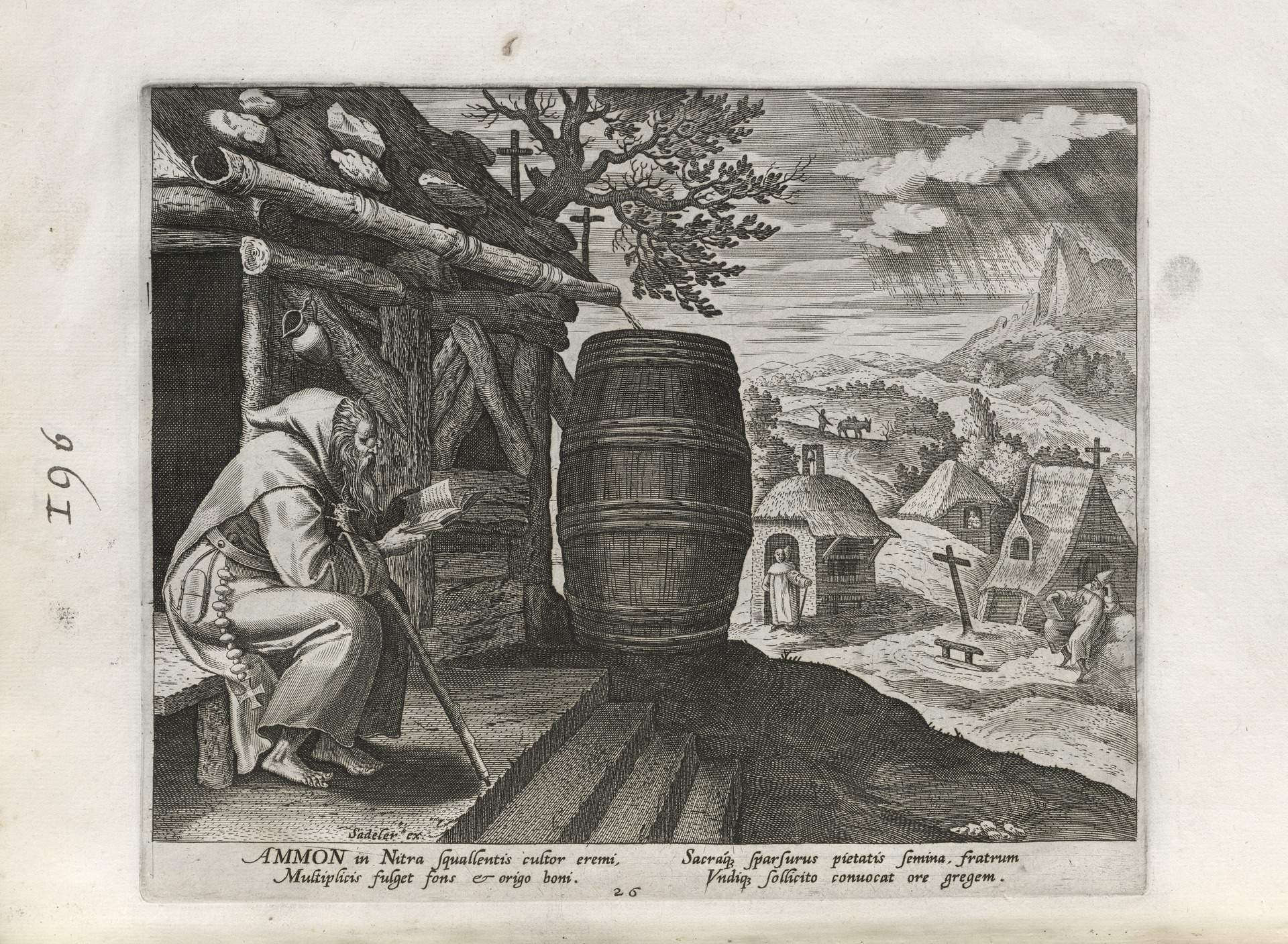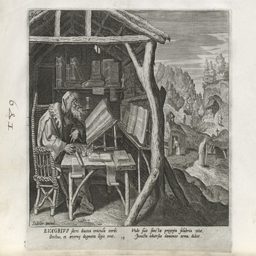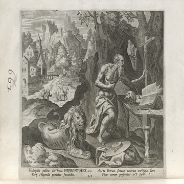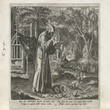 The Sadeler brothers were engravers and publishers, sometimes publishing another engraver. Their portfolio respresented ancient desert Christian hermits, in an idyllic semi-rural setting, anacronistically not antiquity or desert, each hermit busy in his task, always an exemplary figure. Who were all of these hermits? We know Paul of Thebes, Anthony, and Jerome, but the others are obscure. Two stand out, besides Jerome with his companinable lion.