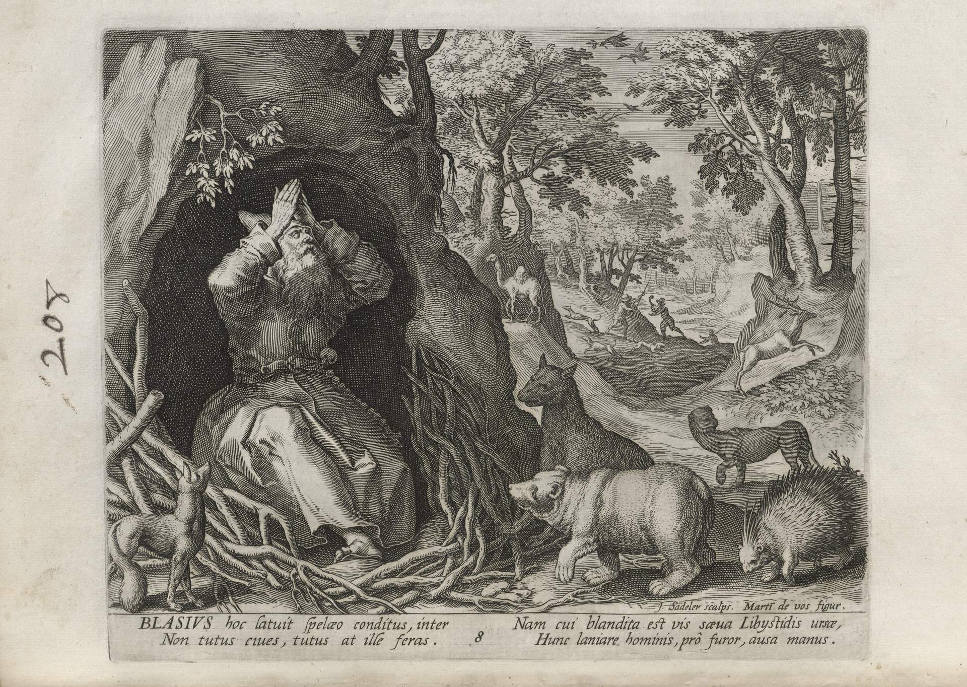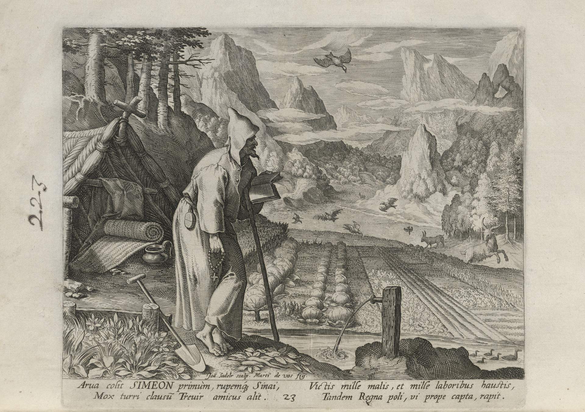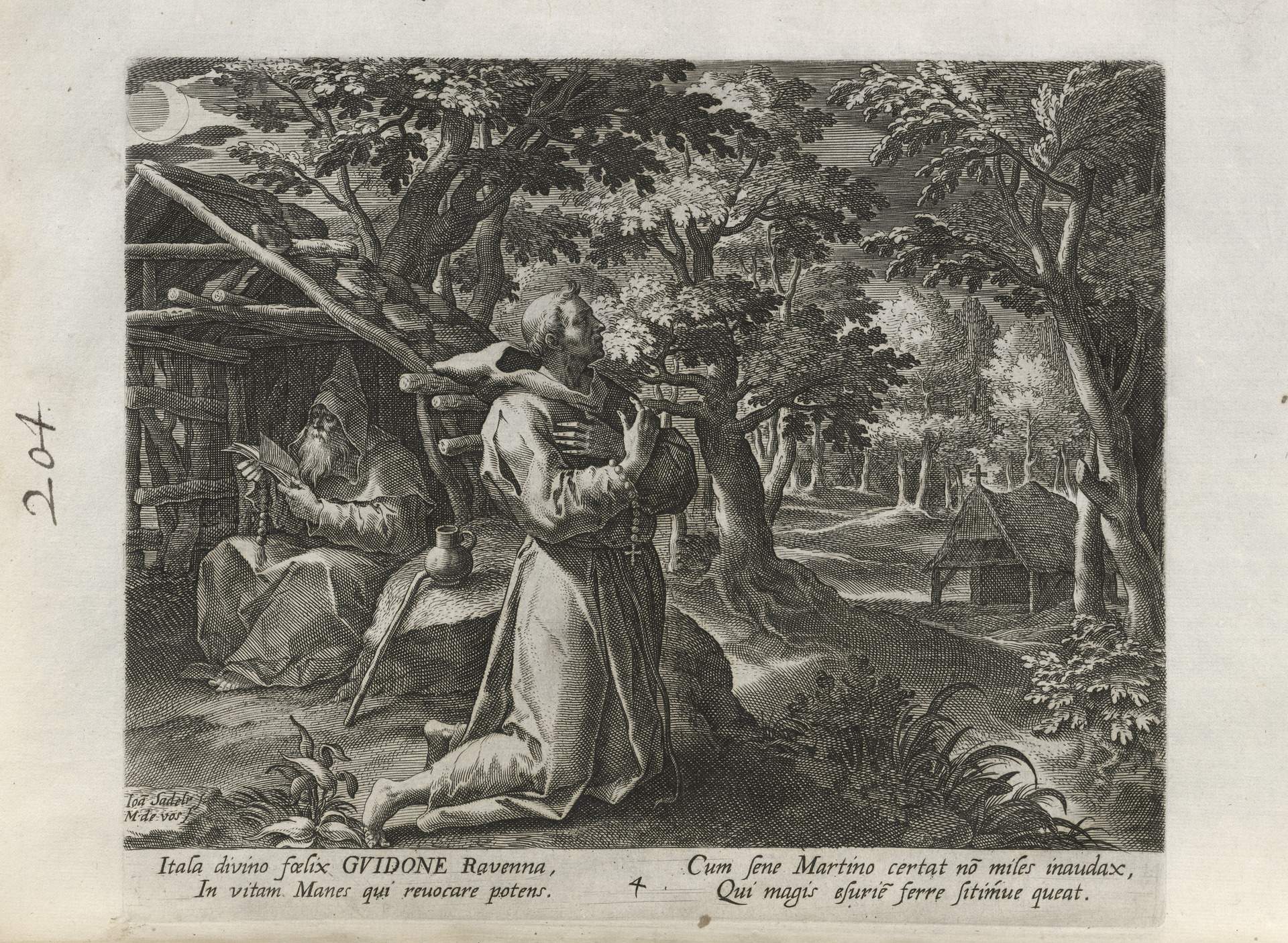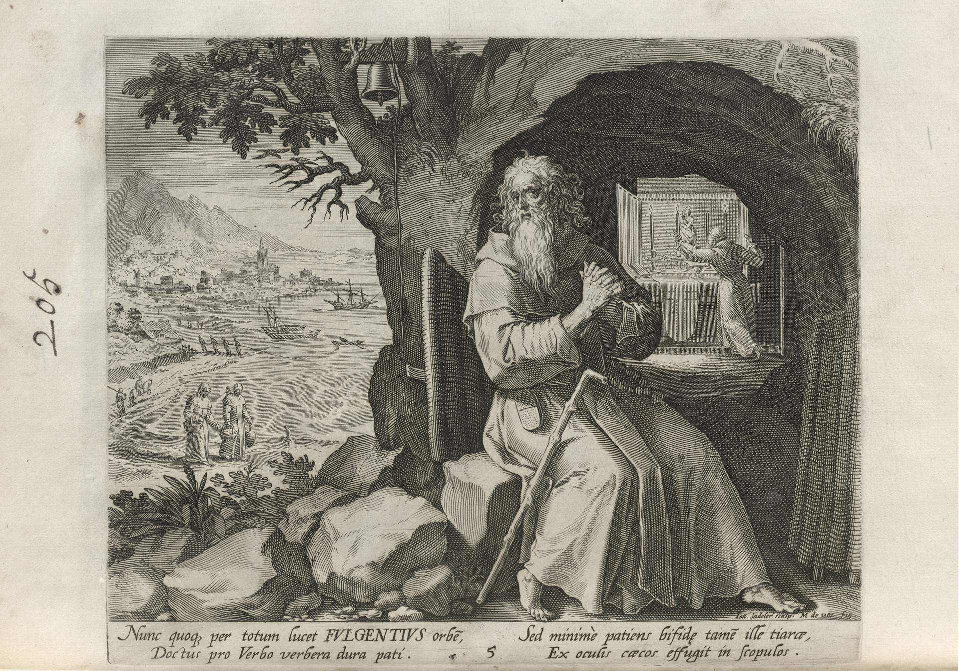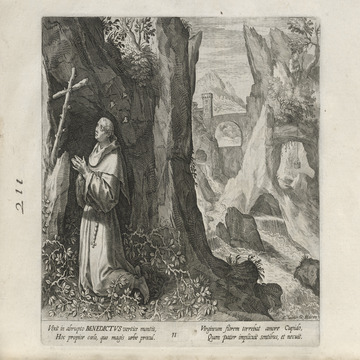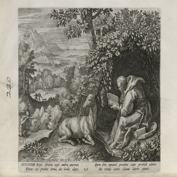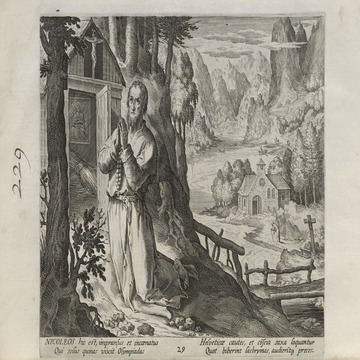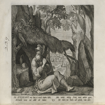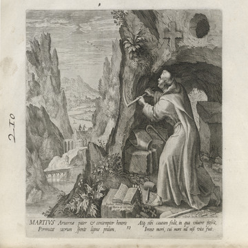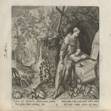 While obscure, the engraver has chosen, perhaps, to make them seem more so in their anachronistic or imagined clothing and settings outside cities suddenly isolated (under the rubric of wilderness but sanctified by the presence of hermits). Curious are the modes of each hermit's diurnal existence highlighted by an unusual detail such as skulls, crucifixes, and beads. A few examples: notice the exposed bones of a gravesite in front of Jacob, the menagerie around Blasius, the sickle of Martius, the deadly apparatus of Zoerardus to ward off sleep. Each of the images has its novelty.