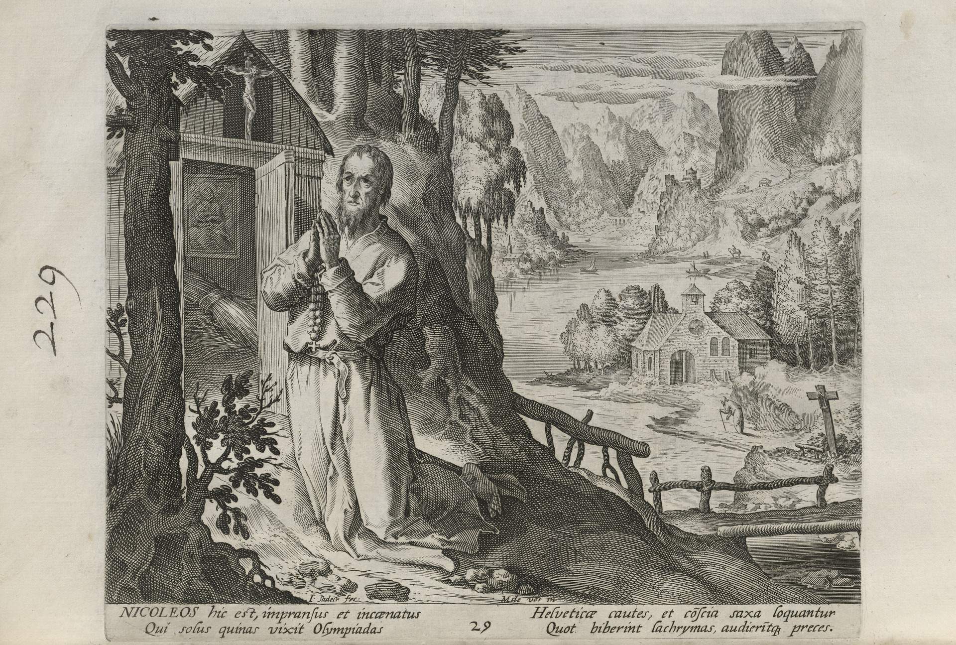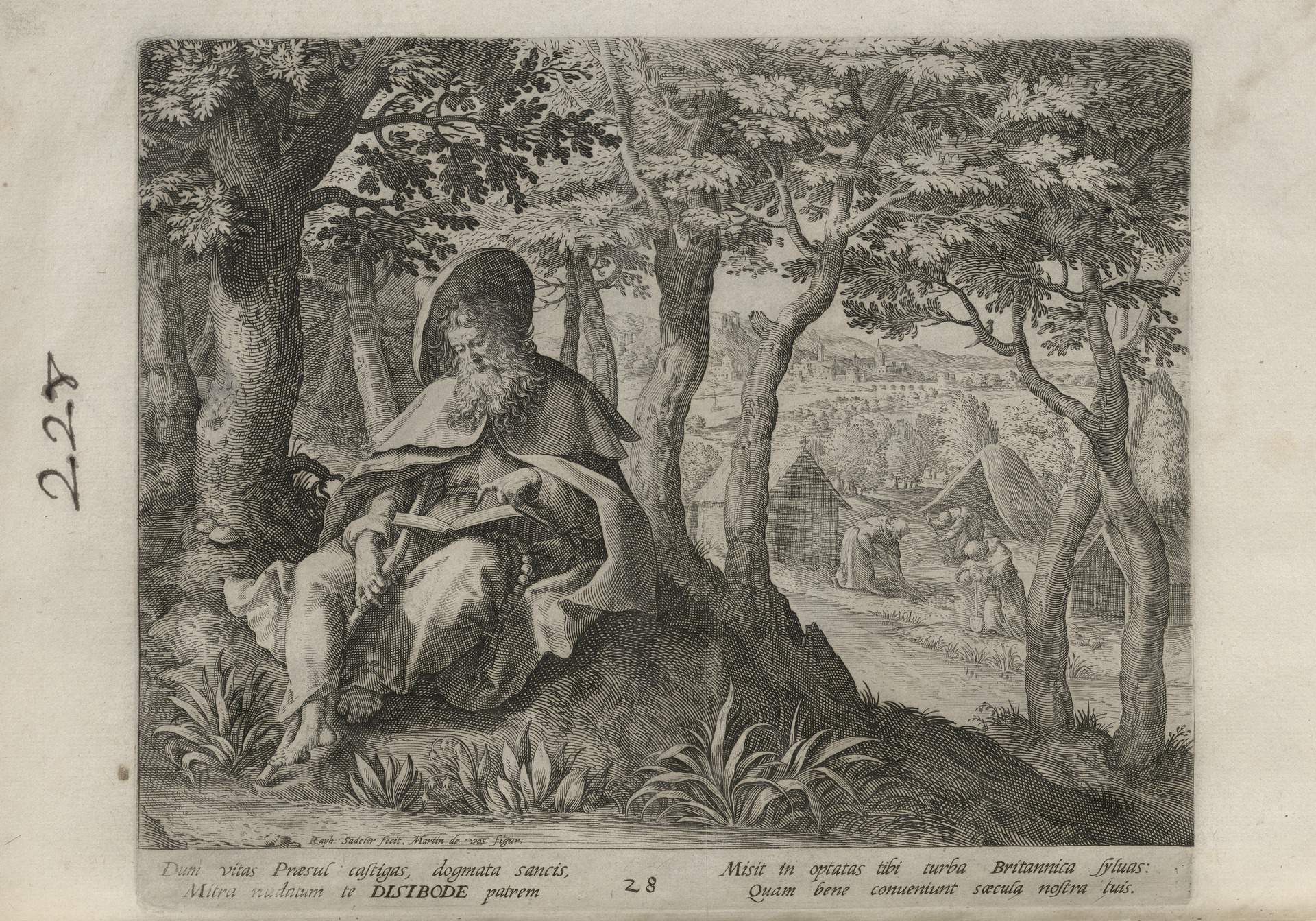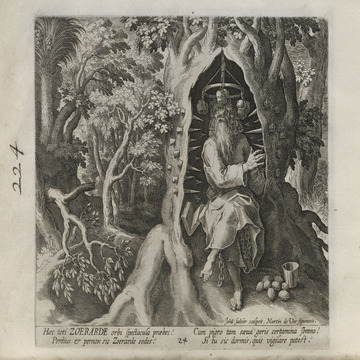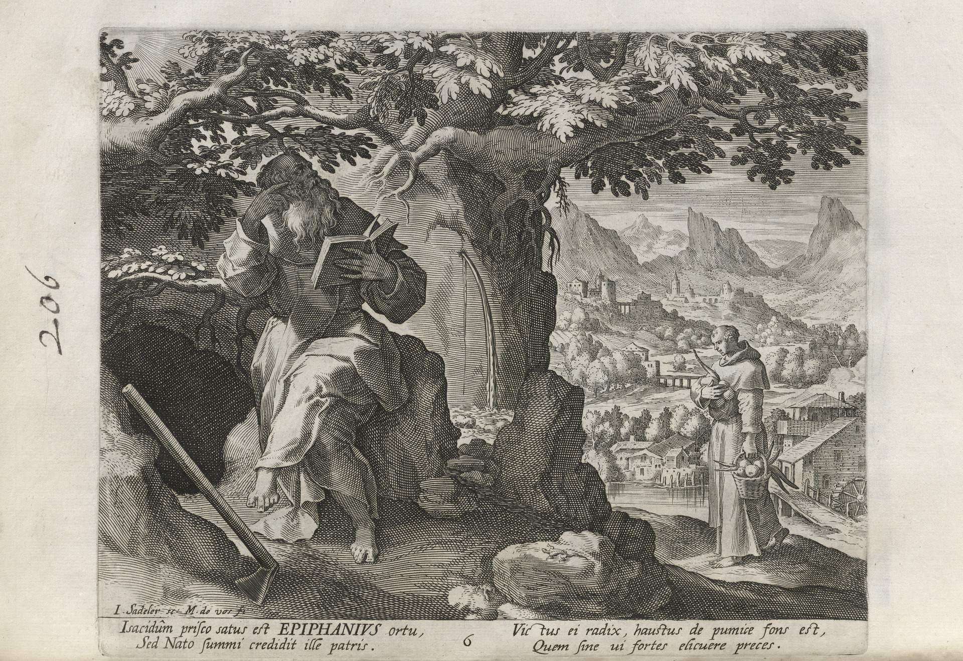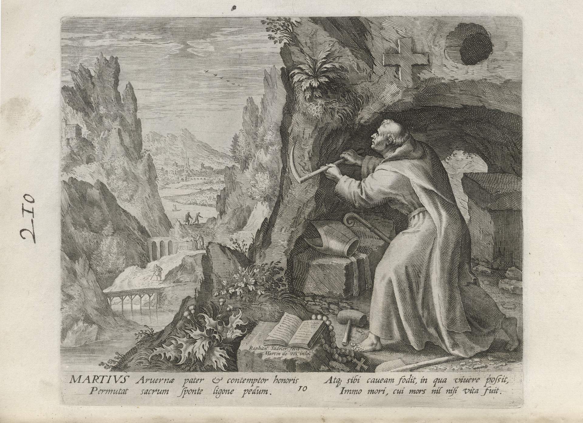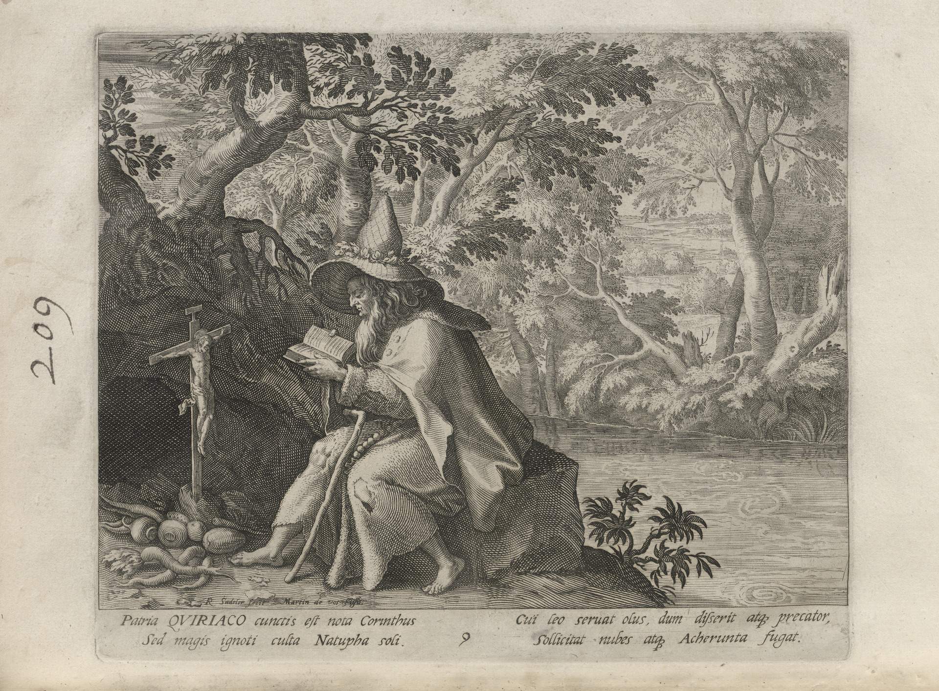 While obscure, the engraver has chosen, perhaps, to make them seem more so in their anachronistic or imagined clothing and settings outside cities suddenly isolated (under the rubric of wilderness but sanctified by the presence of hermits). Curious are the modes of each hermit's diurnal existence highlighted by an unusual detail such as skulls, crucifixes, and beads. A few examples: notice the exposed bones of a gravesite in front of Jacob, the menagerie around Blasius, the sickle of Martius, the deadly apparatus of Zoerardus to ward off sleep. Each of the images has its novelty.