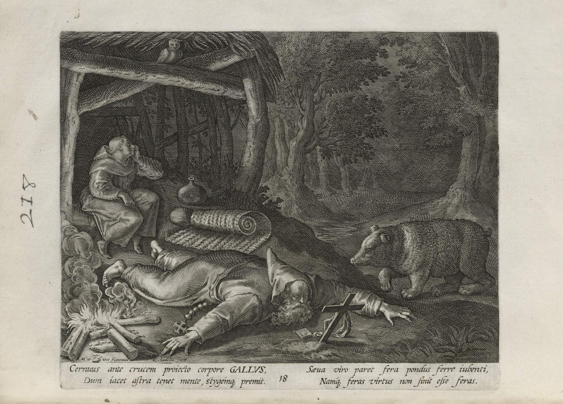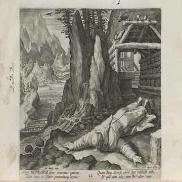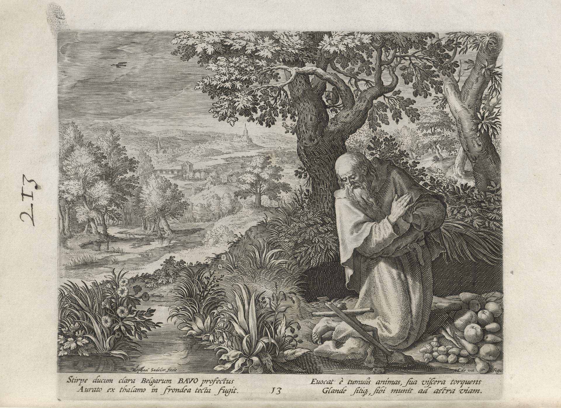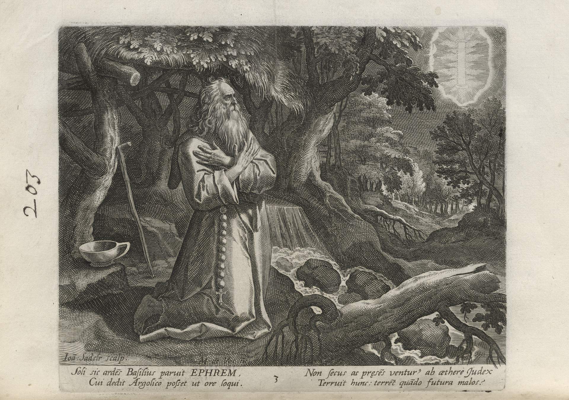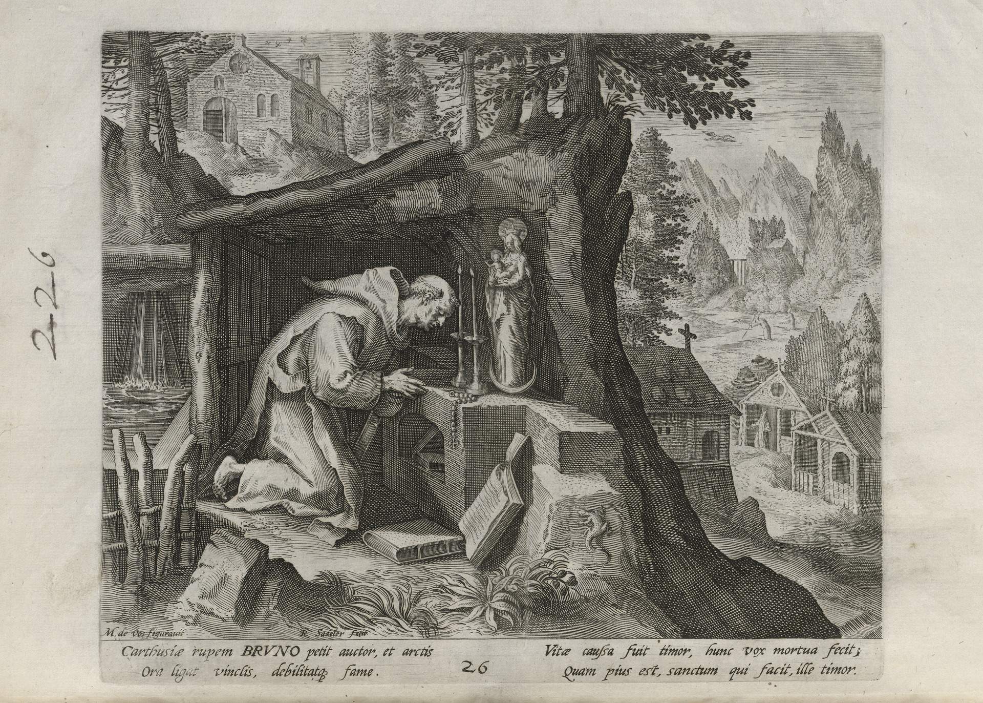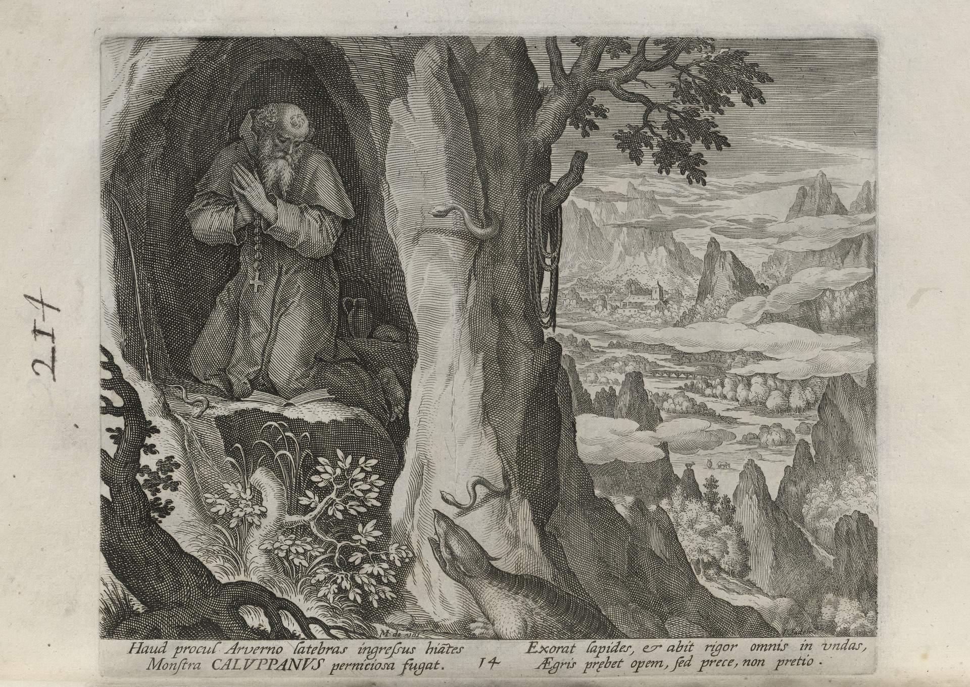 While obscure, the engraver has chosen, perhaps, to make them seem more so in their anachronistic or imagined clothing and settings outside cities suddenly isolated (under the rubric of wilderness but sanctified by the presence of hermits). Curious are the modes of each hermit's diurnal existence highlighted by an unusual detail such as skulls, crucifixes, and beads. A few examples: notice the exposed bones of a gravesite in front of Jacob, the menagerie around Blasius, the sickle of Martius, the deadly apparatus of Zoerardus to ward off sleep. Each of the images has its novelty.