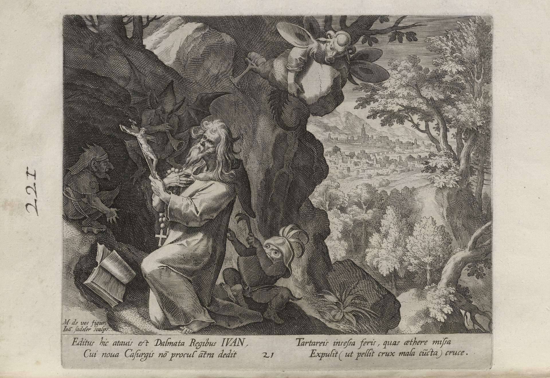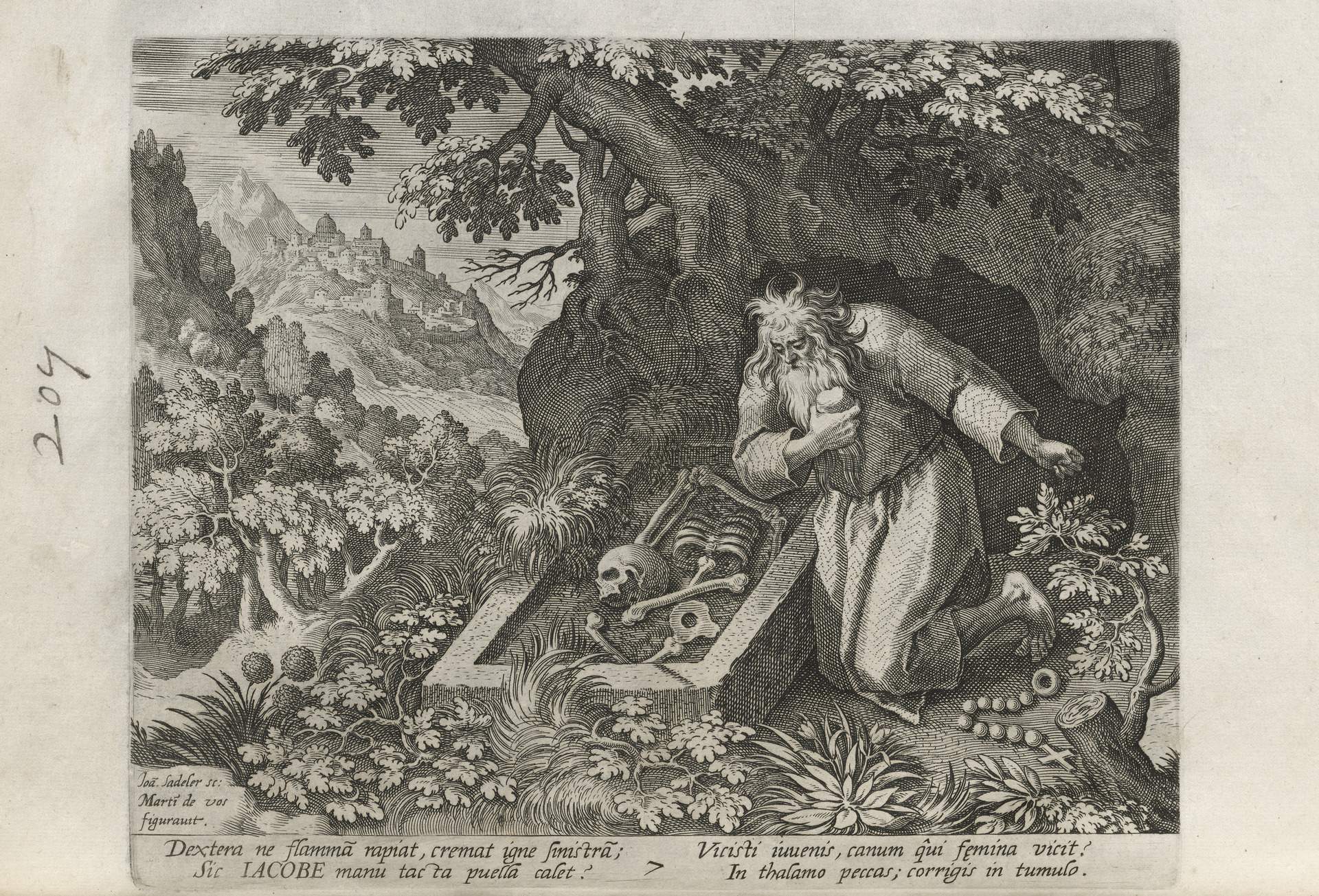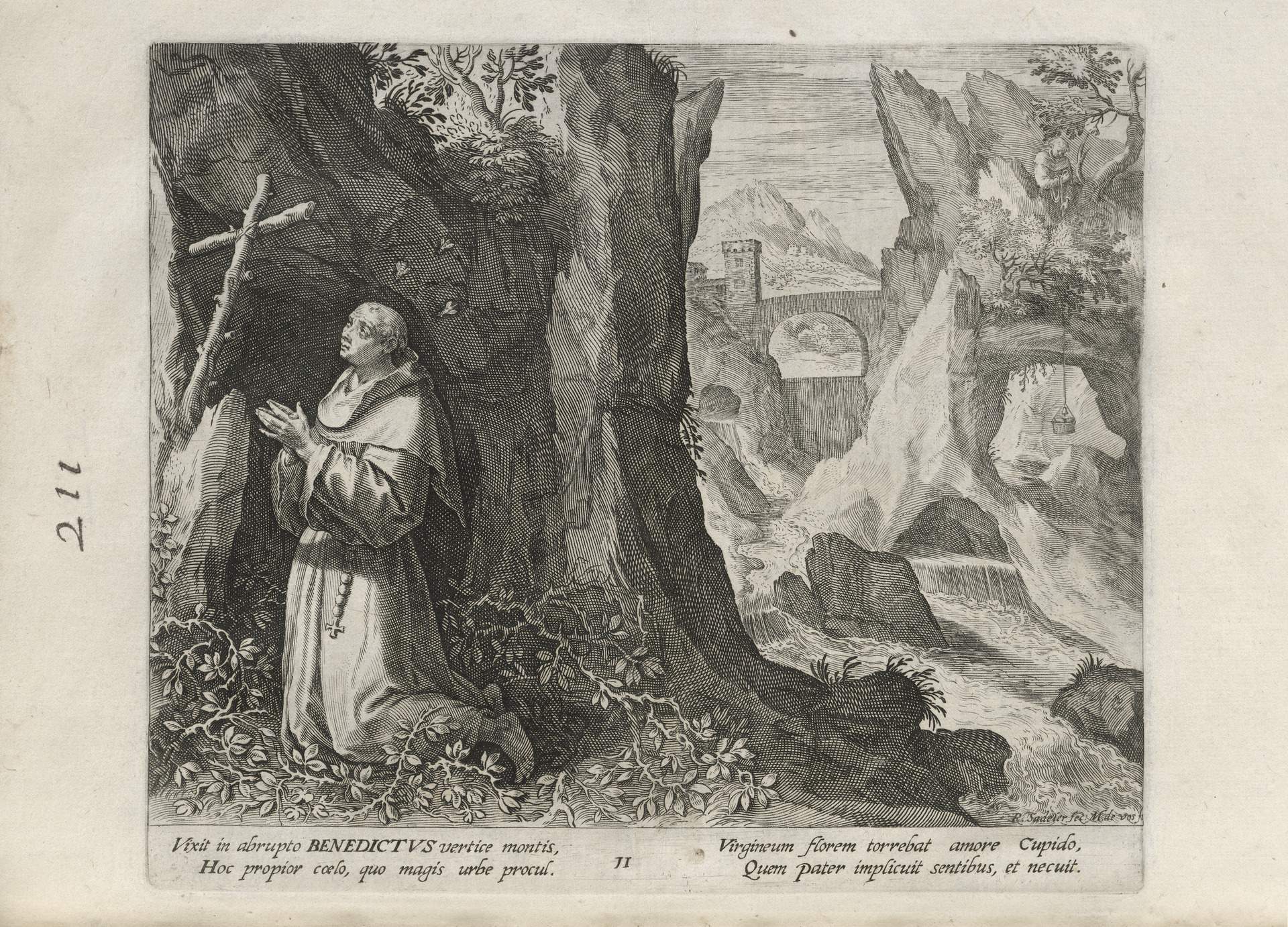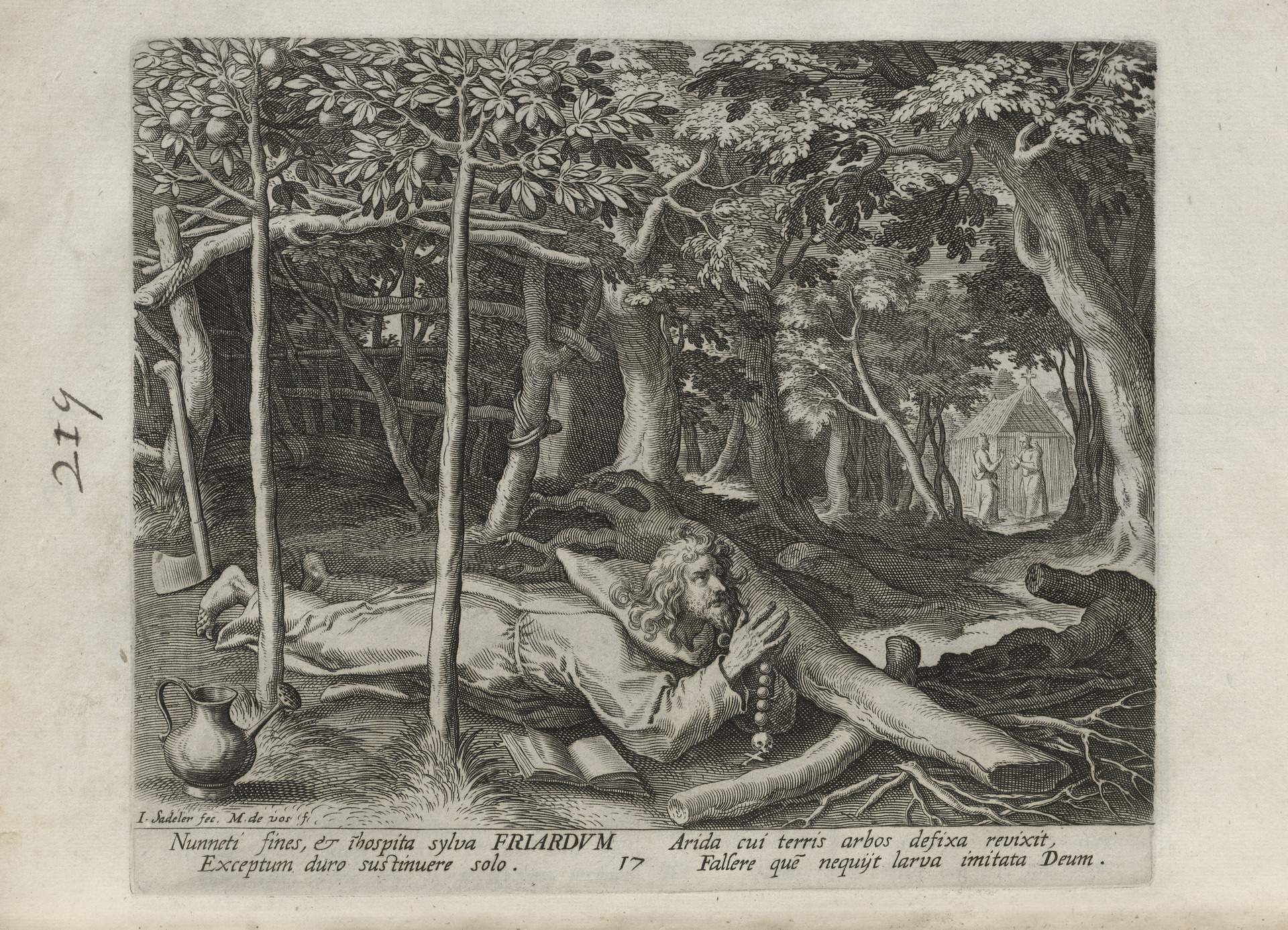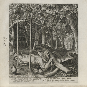 While obscure, the engraver has chosen, perhaps, to make them seem more so in their anachronistic or imagined clothing and settings outside cities suddenly isolated (under the rubric of wilderness but sanctified by the presence of hermits). Curious are the modes of each hermit's diurnal existence highlighted by an unusual detail such as skulls, crucifixes, and beads. A few examples: notice the exposed bones of a gravesite in front of Jacob, the menagerie around Blasius, the sickle of Martius, the deadly apparatus of Zoerardus to ward off sleep. Each of the images has its novelty.
