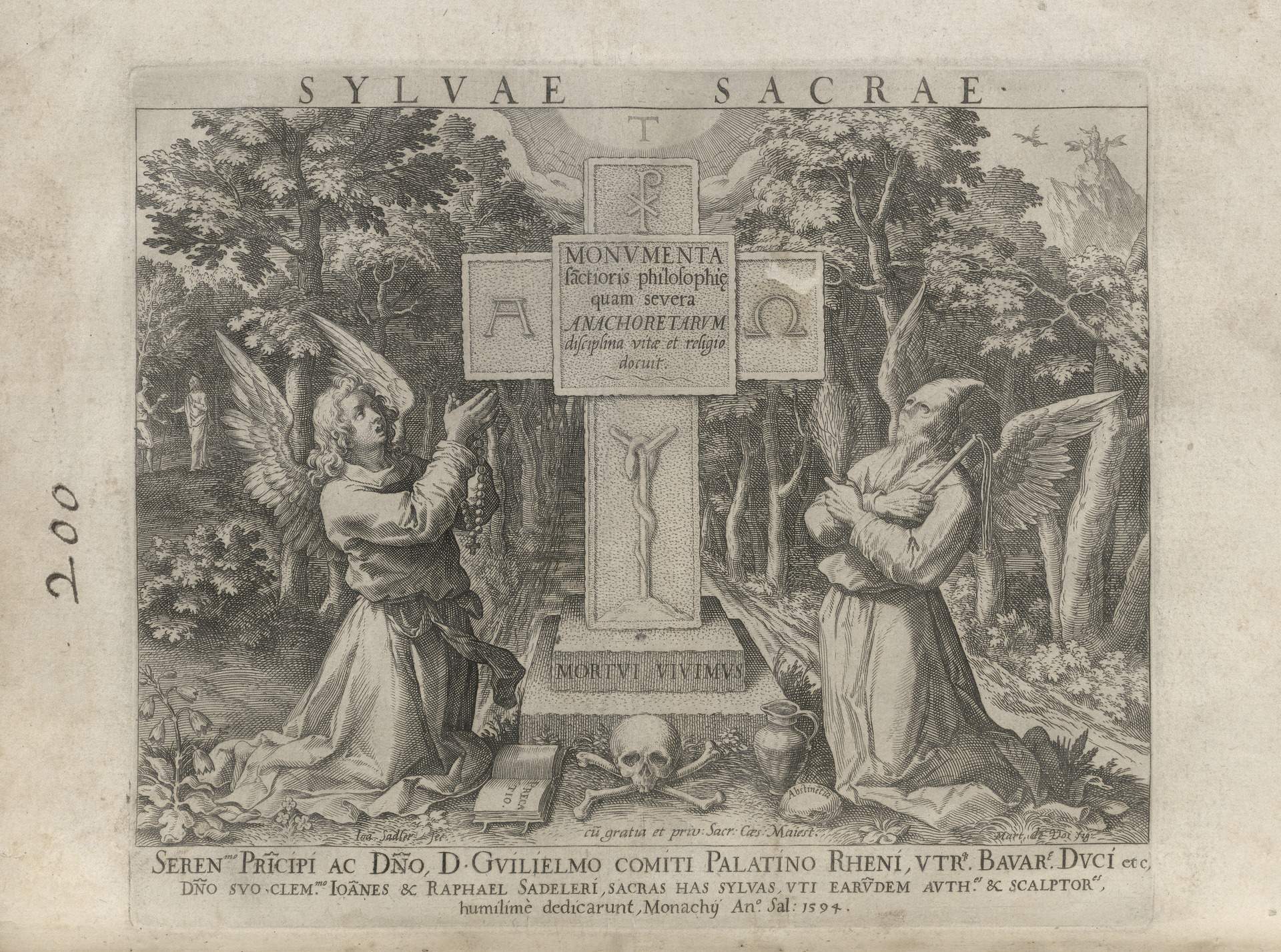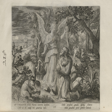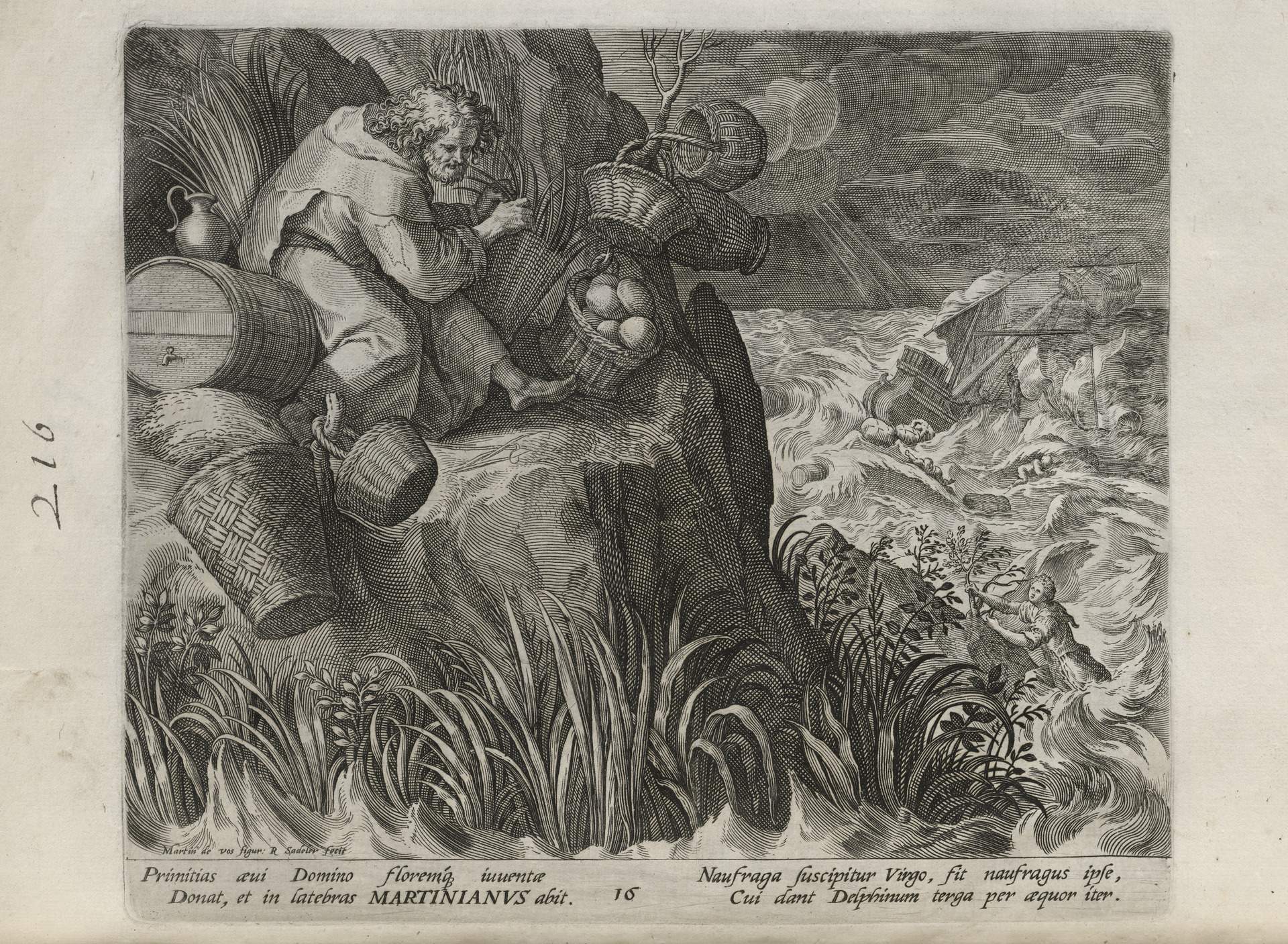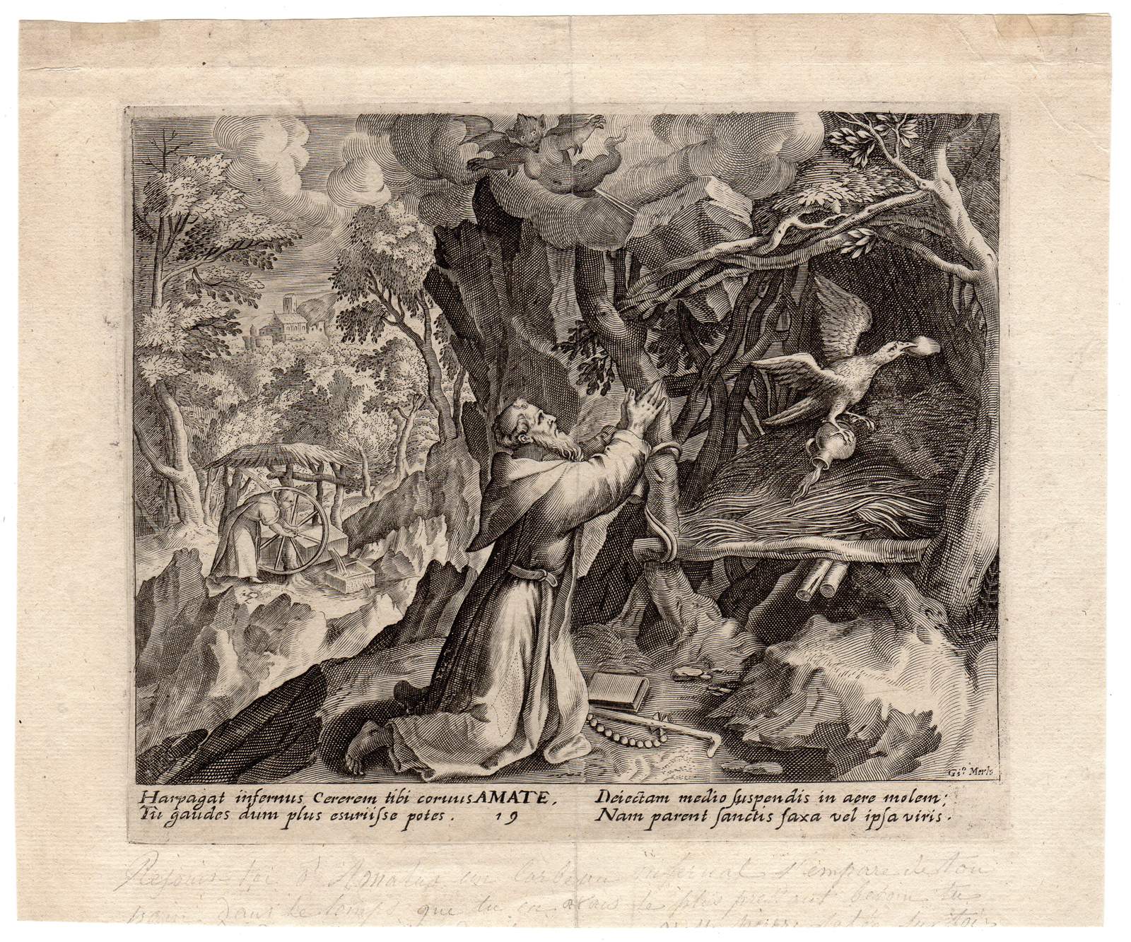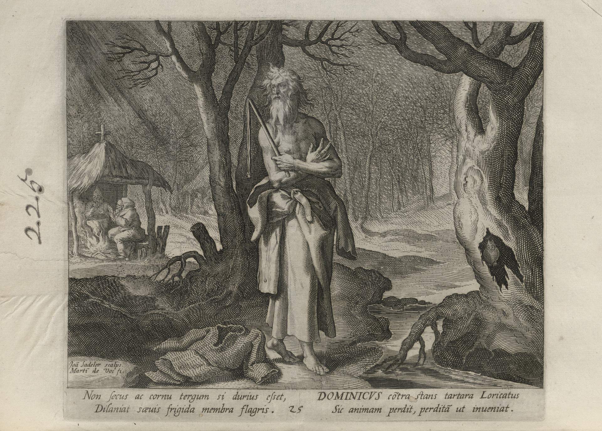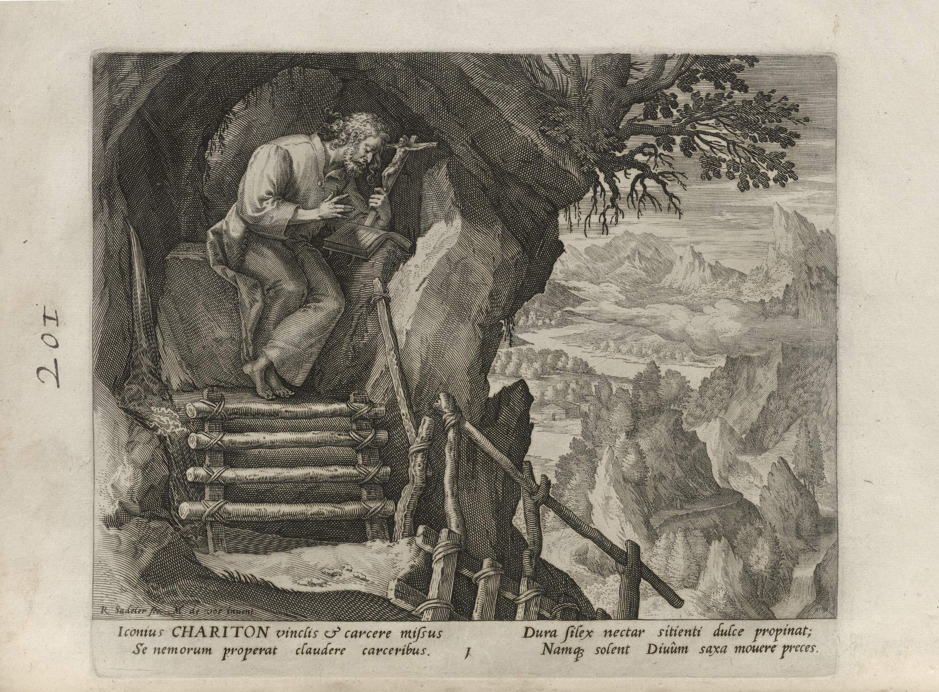 While obscure, the engraver has chosen, perhaps, to make them seem more so in their anachronistic or imagined clothing and settings outside cities suddenly isolated (under the rubric of wilderness but sanctified by the presence of hermits). Curious are the modes of each hermit's diurnal existence highlighted by an unusual detail such as skulls, crucifixes, and beads. A few examples: notice the exposed bones of a gravesite in front of Jacob, the menagerie around Blasius, the sickle of Martius, the deadly apparatus of Zoerardus to ward off sleep. Each of the images has its novelty.