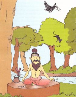 Long ago, in a hermitage, there lived a great sage. One day, as he sat down to have his lunch, a mouse fell from the beak of a crow, on the ground near him. He picked the mouse up, took him inside the ashram and fed him some rice.